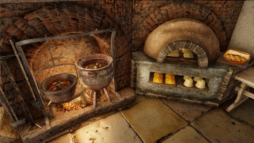 かまど右側にある鍋に火を点けると、その隣の鍋が料理鍋として使えるようになります。他にも蛇口をひねって水を出したりすることも。