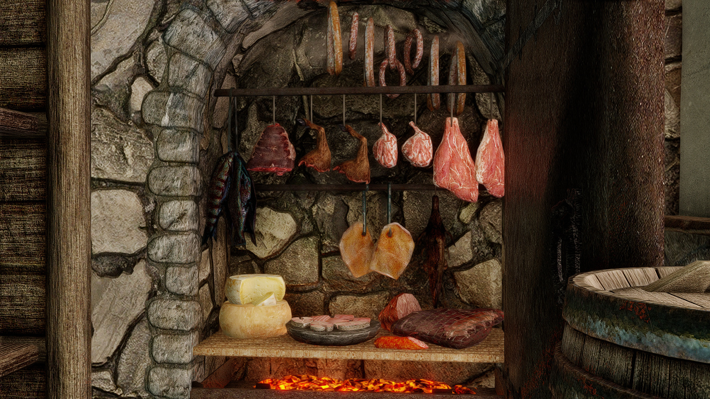 部屋の奥は燻製室や冷蔵庫など、食品関係の収納スペースになっています。