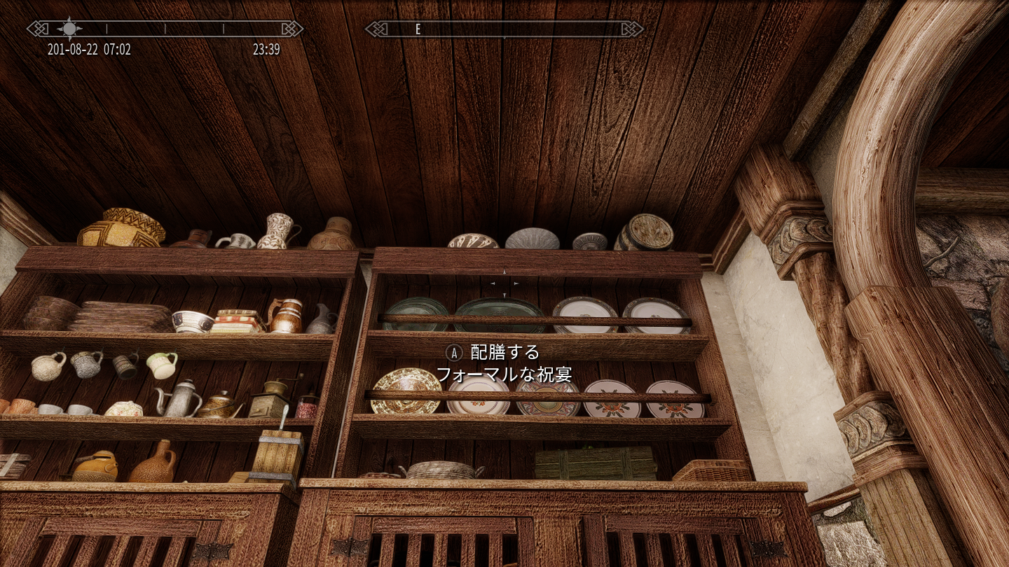 食器棚の右側をアクティベートした際は、1階ダイニングのテーブルにごちそうが並び、椅子も座れるようになります。お片付けは暖炉側左側のお皿から。