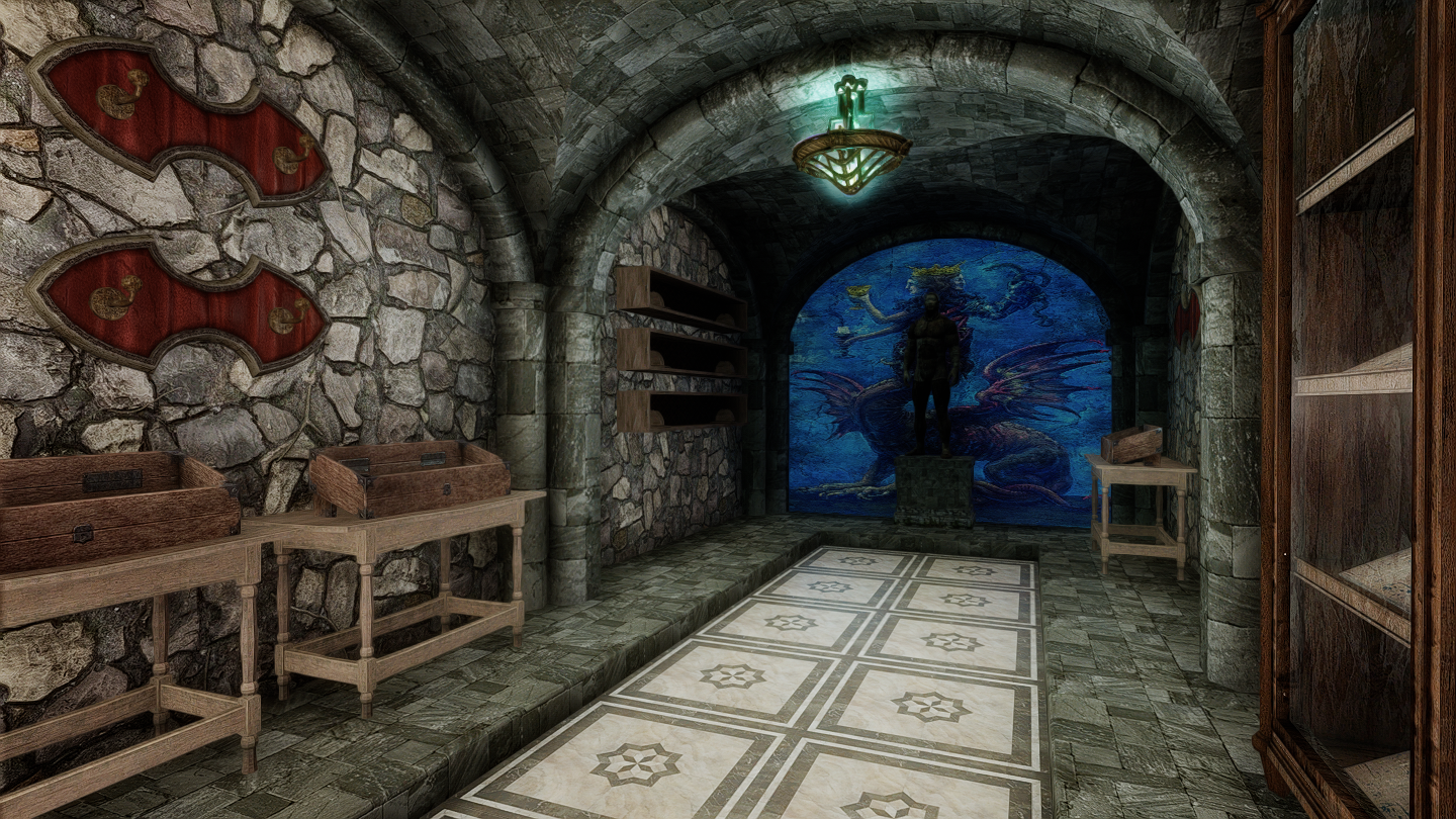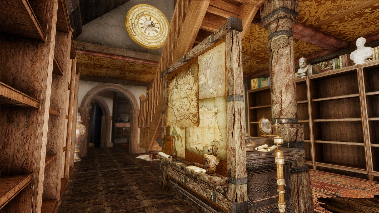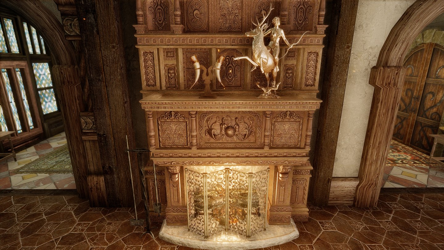 暖炉の近くの机がアルケイン付呪器になっています。また、窓際にある陳列棚の扉は開閉可能です。