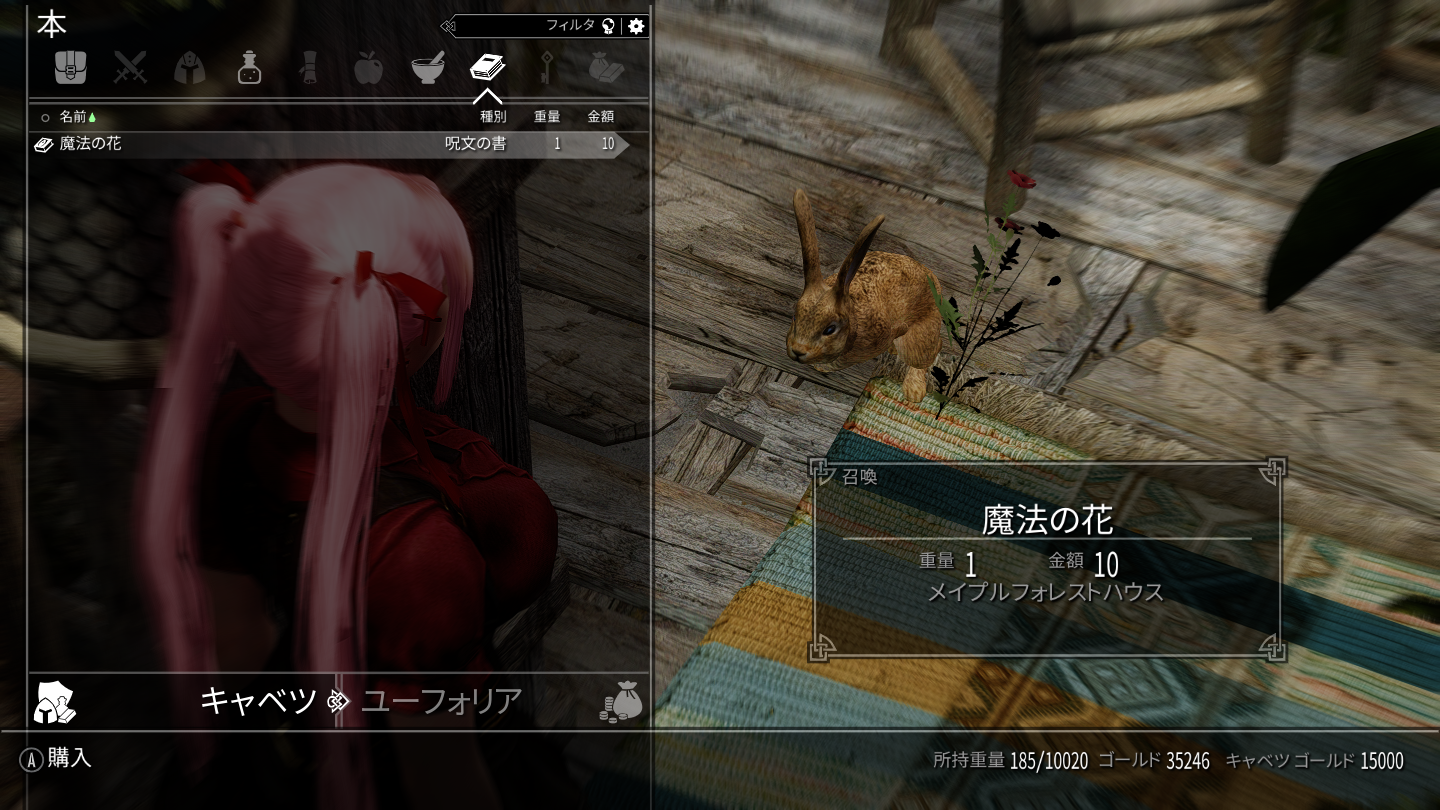 毛皮以外のアイテムの他、この家のテレポート呪文の書(花)も売ってくれます。コストなしで使える召喚魔法になっています。