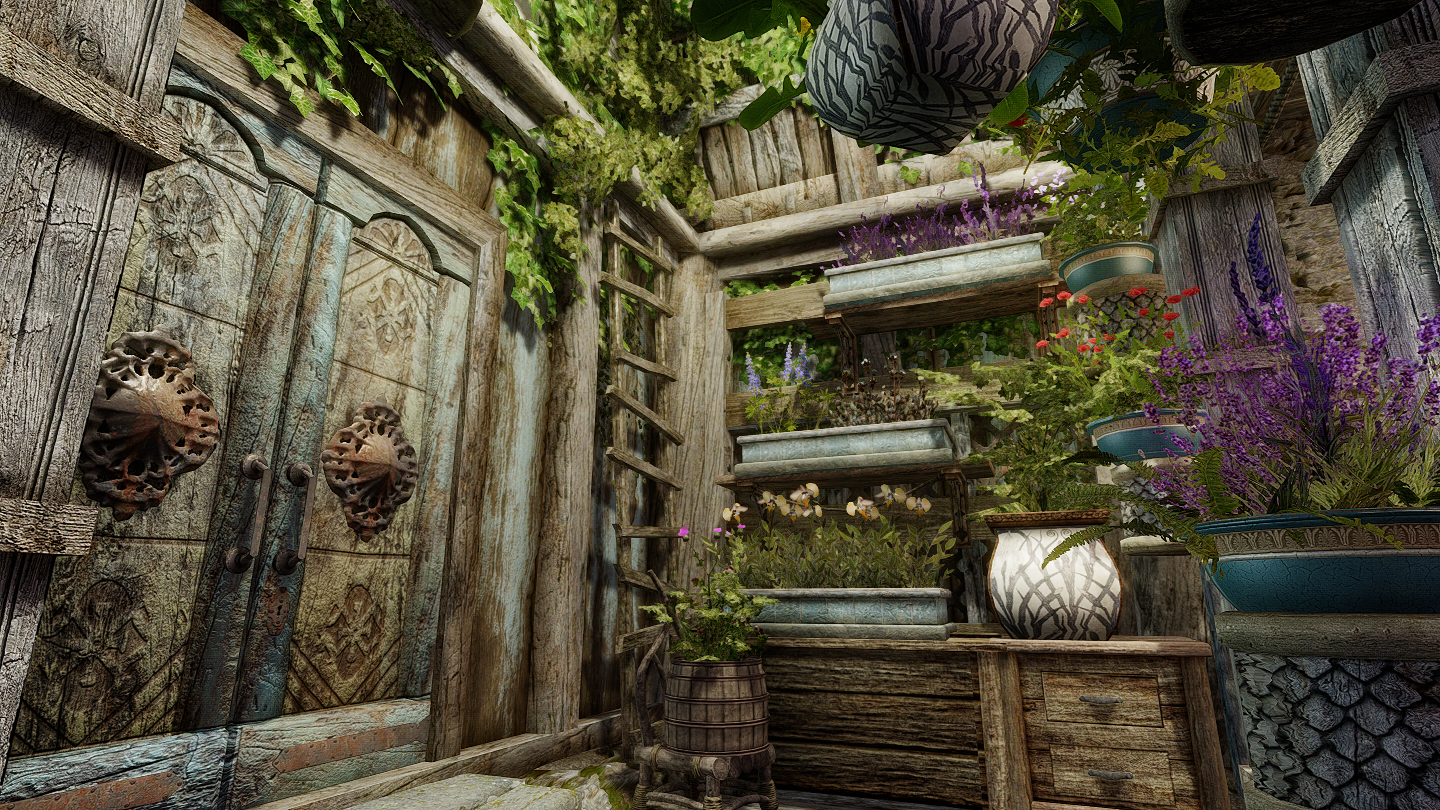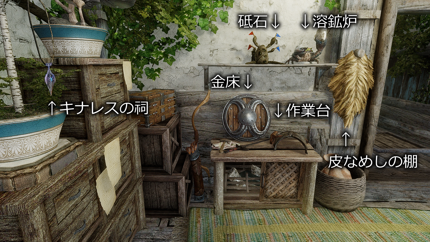 - 書斎:皮なめしの棚/作業台/金床/砥石/溶鉱炉/キナレスの祠/付呪器/杖用の付呪器