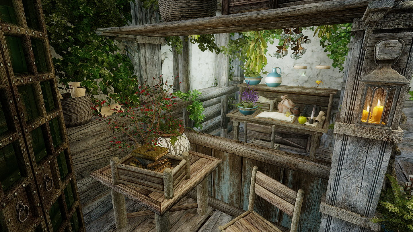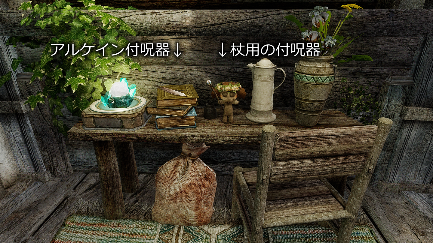 - 書斎:皮なめしの棚/作業台/金床/砥石/溶鉱炉/キナレスの祠/付呪器/杖用の付呪器