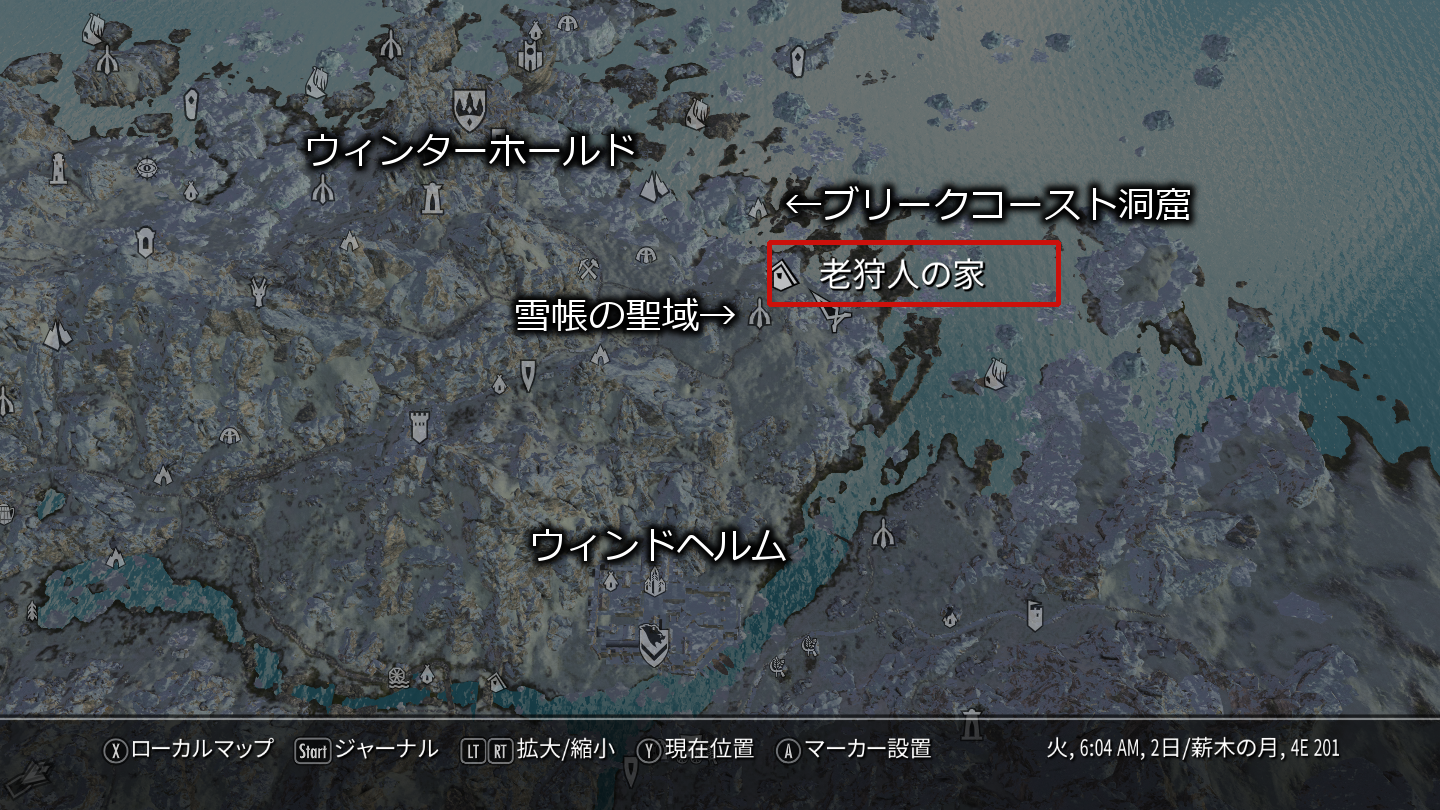 ウィンターホールドとウィンドヘルムの中間辺りにある、雪帳の聖域が最寄りになっています。