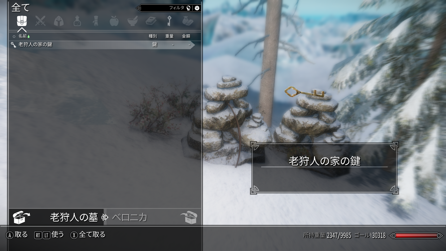 家の左側にある、弓が立てかけられている方のお墓に家の鍵があります。