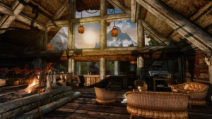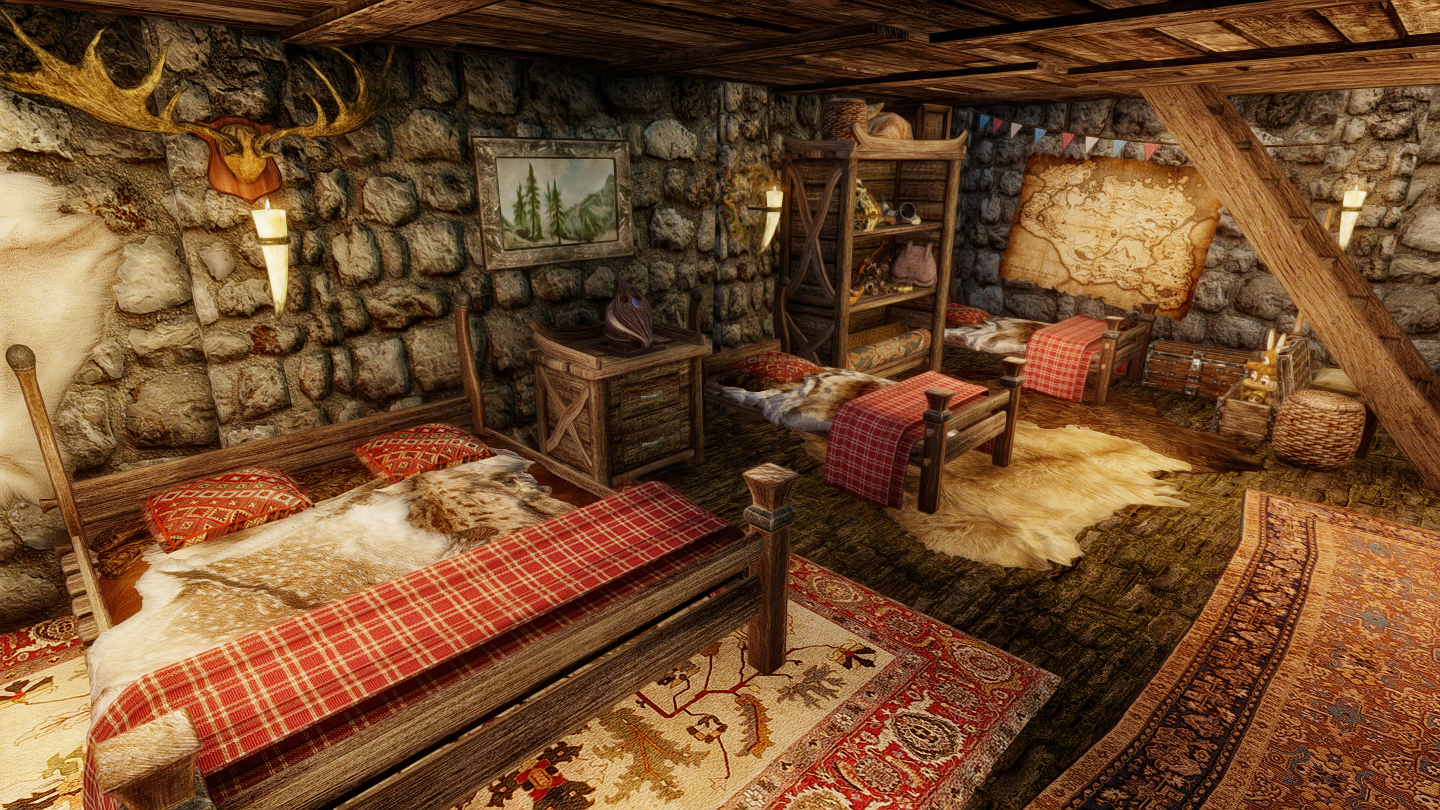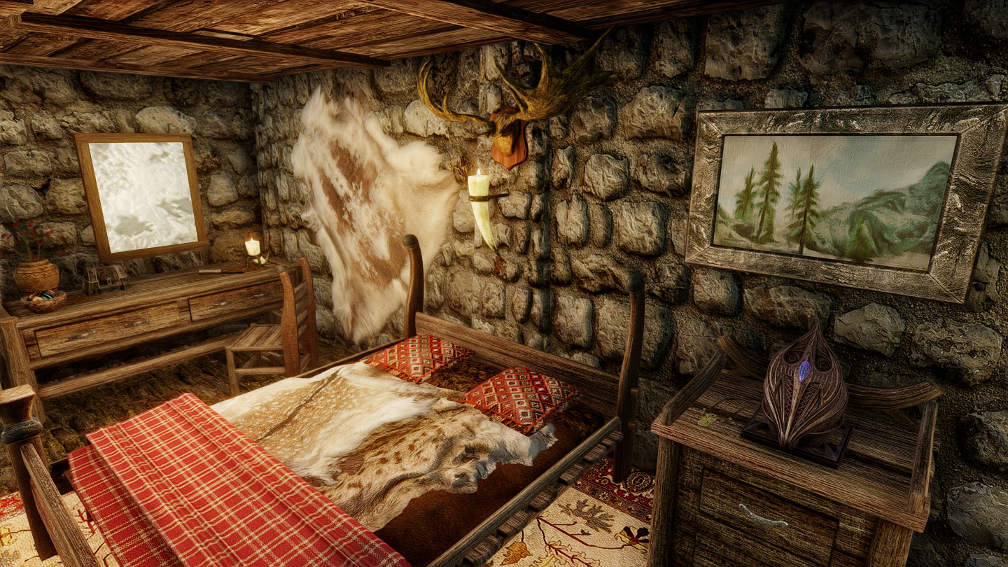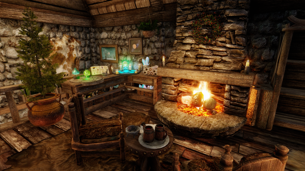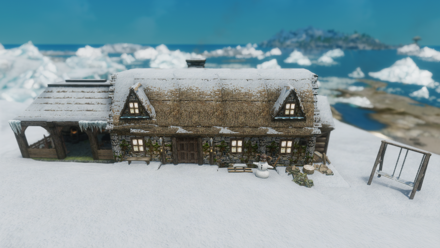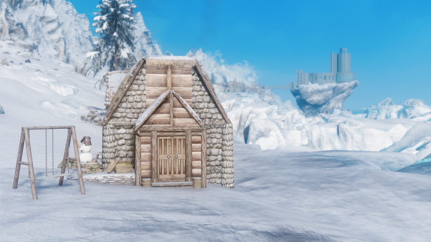 ウィンターホールド地方・雪帳の聖域近くに、かつて狩人の一家が住んでいたという設定の家を追加するMODです。屋内にはお風呂や子供用ベッド、飾り付けができるツリーなどがあります。
