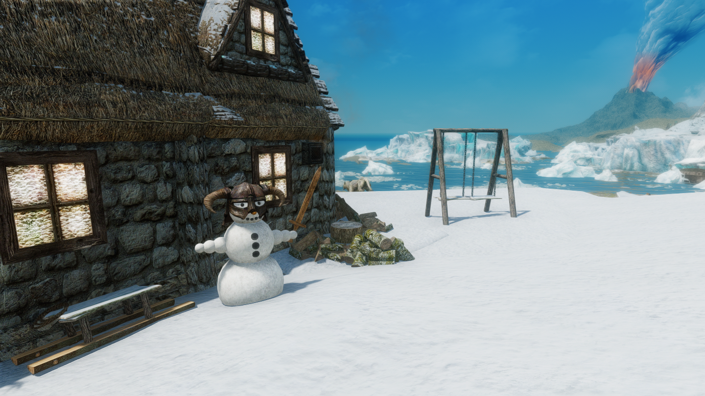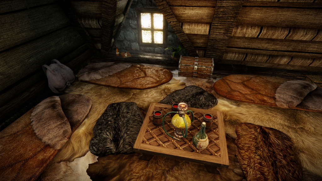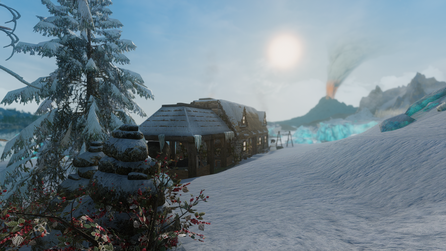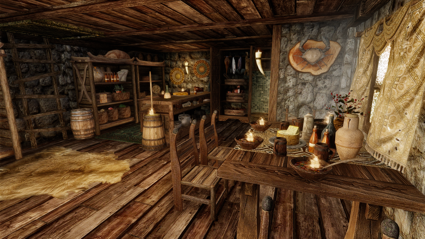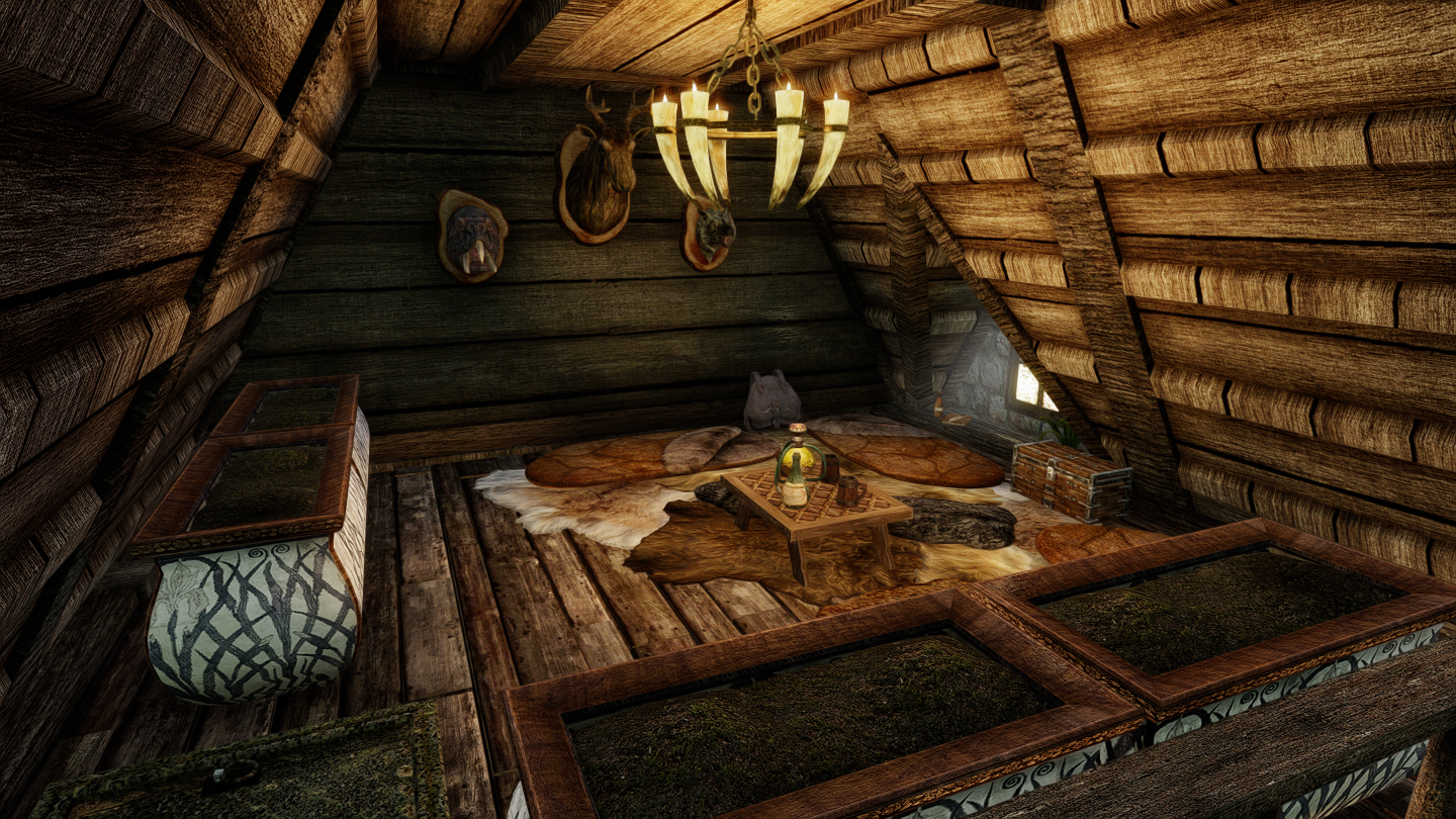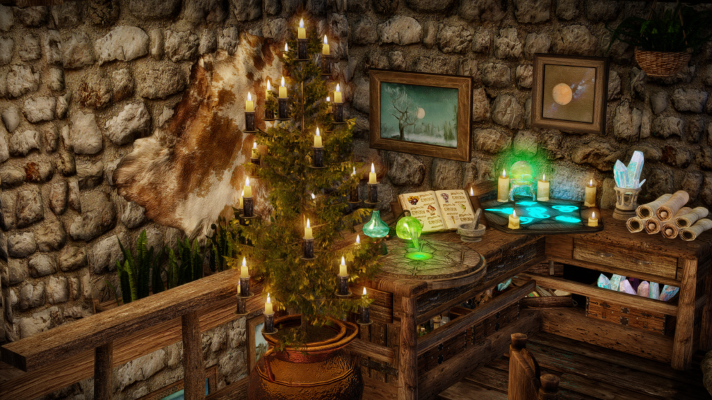 ウィンターホールド地方・雪帳の聖域近くに、かつて狩人の一家が住んでいたという設定の家を追加するMODです。屋内にはお風呂や子供用ベッド、飾り付けができるツリーなどがあります。