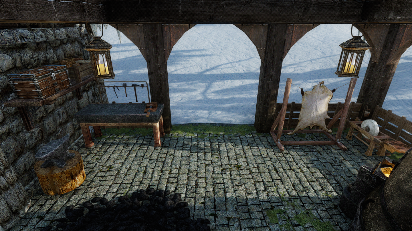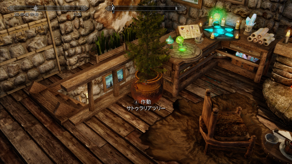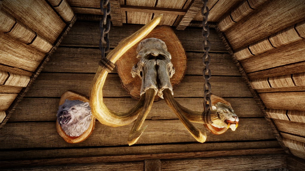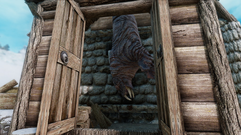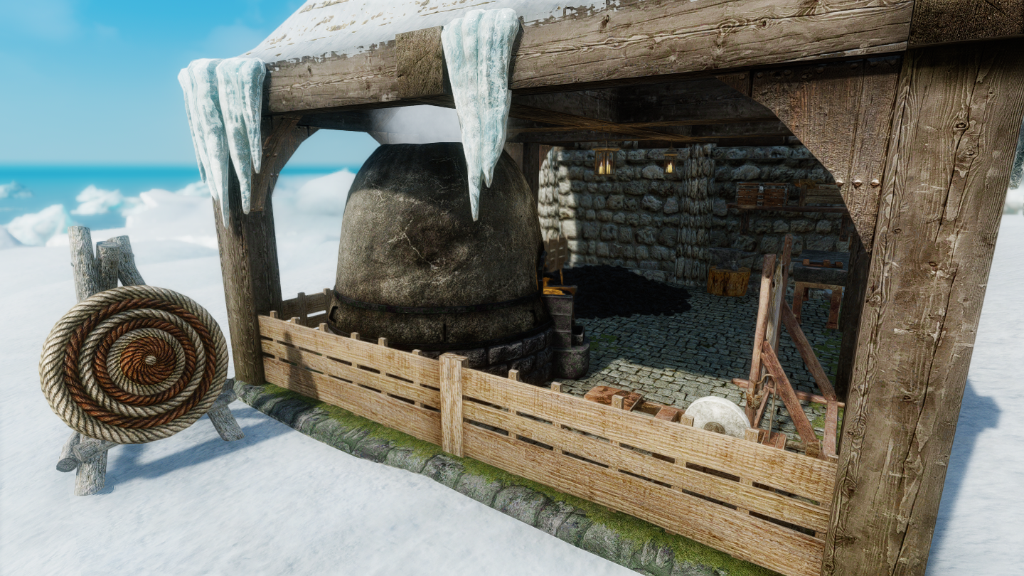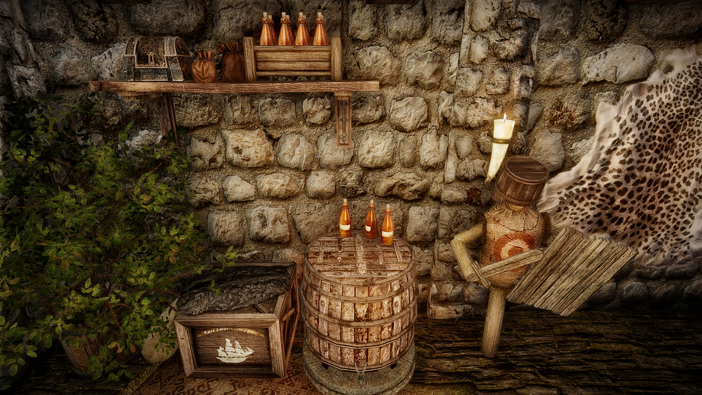 ウィンターホールド地方・雪帳の聖域近くに、かつて狩人の一家が住んでいたという設定の家を追加するMODです。屋内にはお風呂や子供用ベッド、飾り付けができるツリーなどがあります。