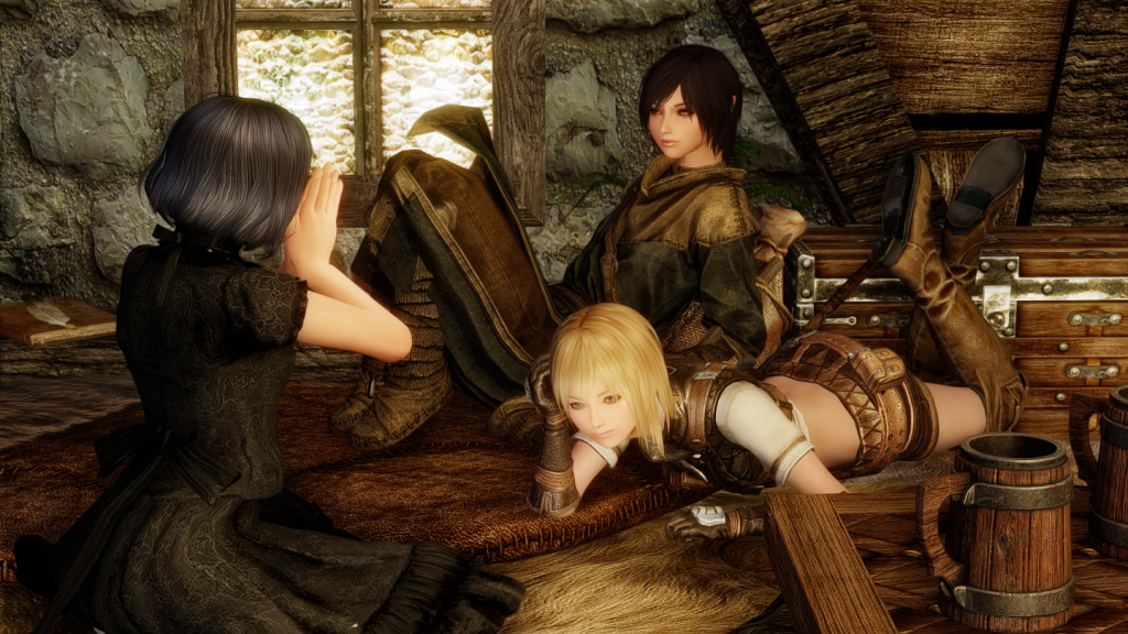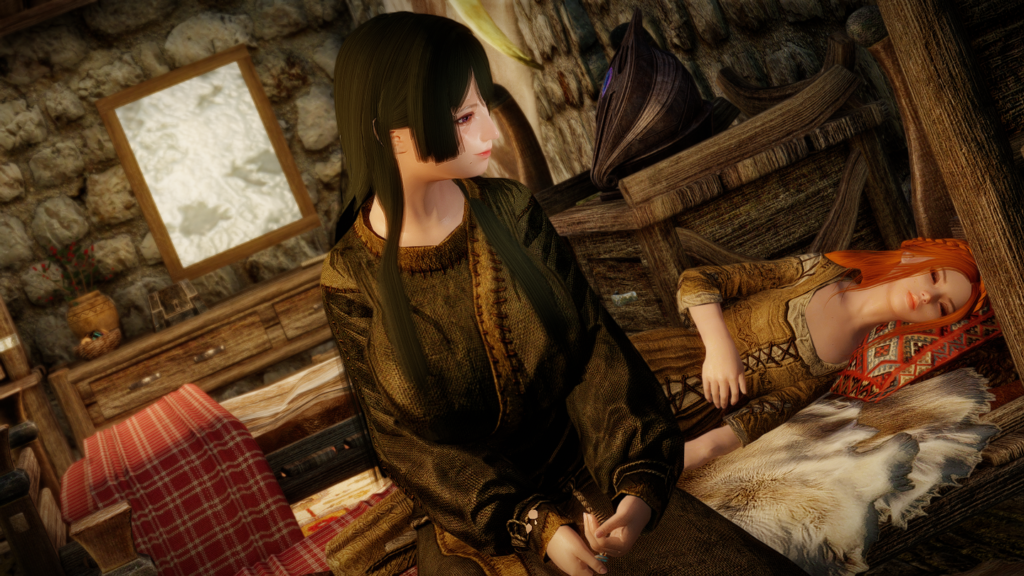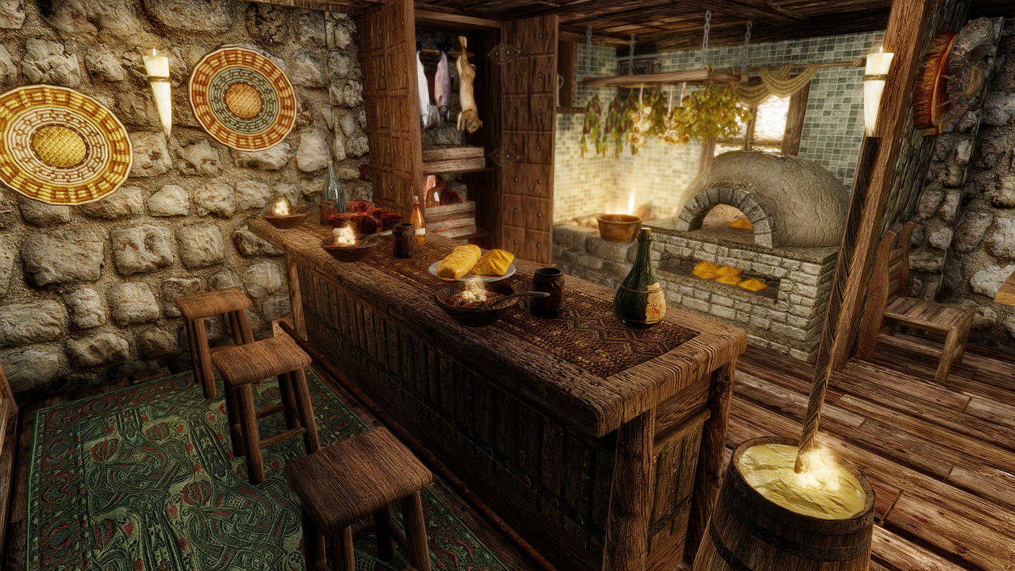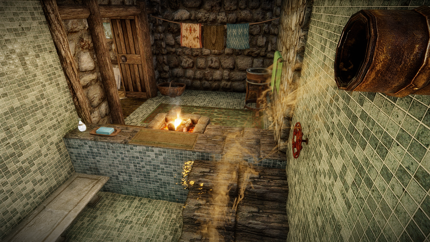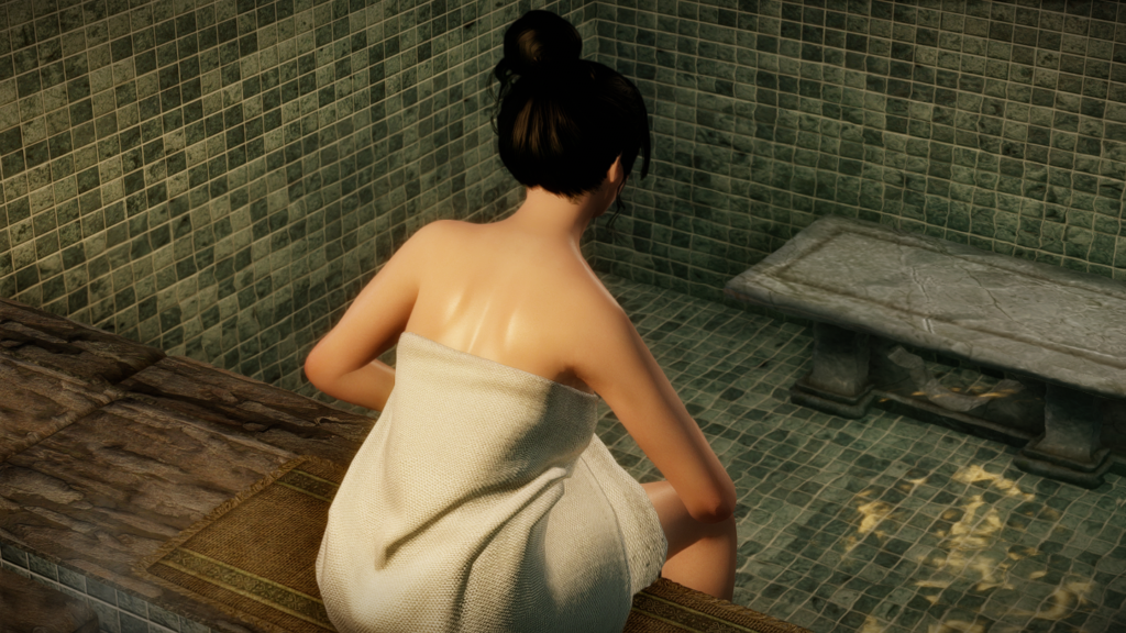 壁のタオルの表示が気になる(上記画像と違う)場合、BSAファイル解凍ツールで該当のメッシュファイルを抽出し、「SSE NIF Optimizer」などで変換・上書きすると解消するかも。