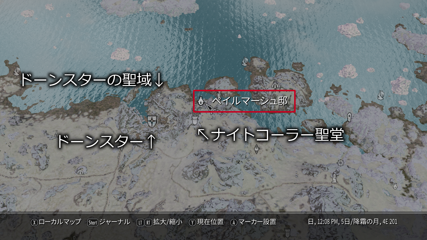 徒歩で向かう際は、ドーンスターを出てドーンスターの聖域を経由して更に海岸沿いを進むか、ナイトコーラ聖堂に向かう途中で坂を下りるかのルートが分かりやすそうです。