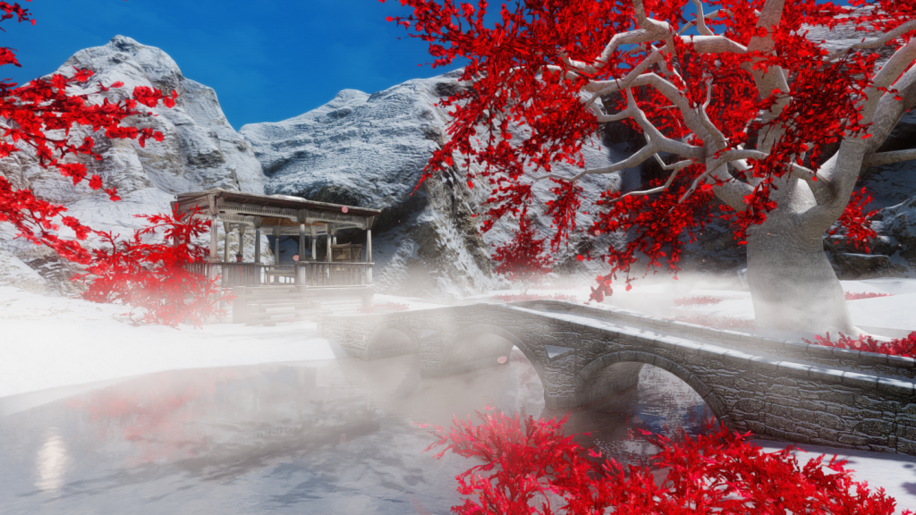 赤い木々や滝が景観のアクセントになってます。