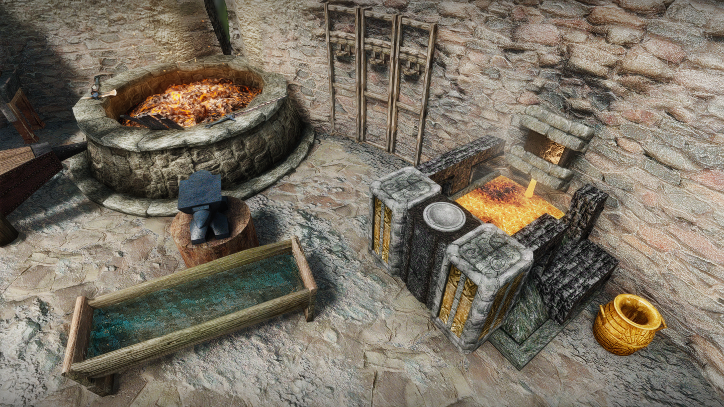 - 浮遊島1:溶鉱炉/鋳造器具/作業台/砥石/皮なめしの棚/料理鍋