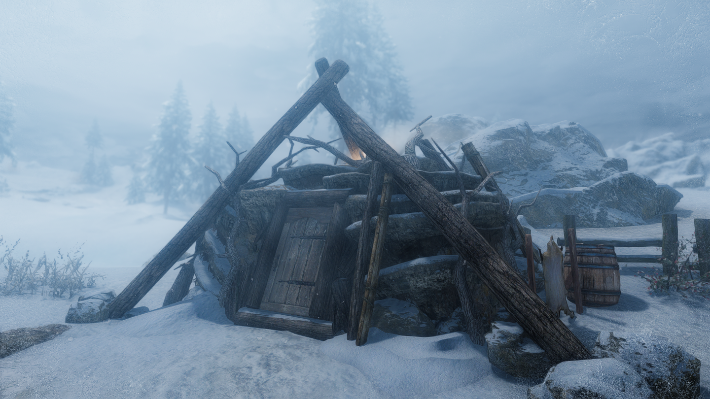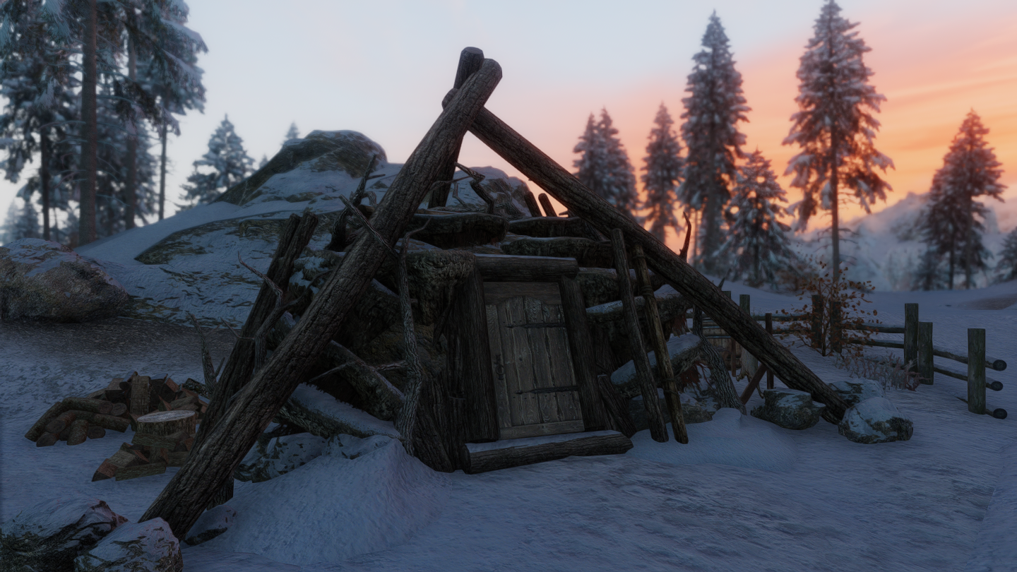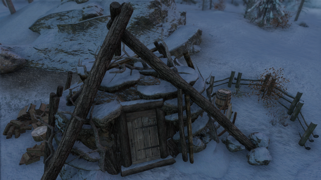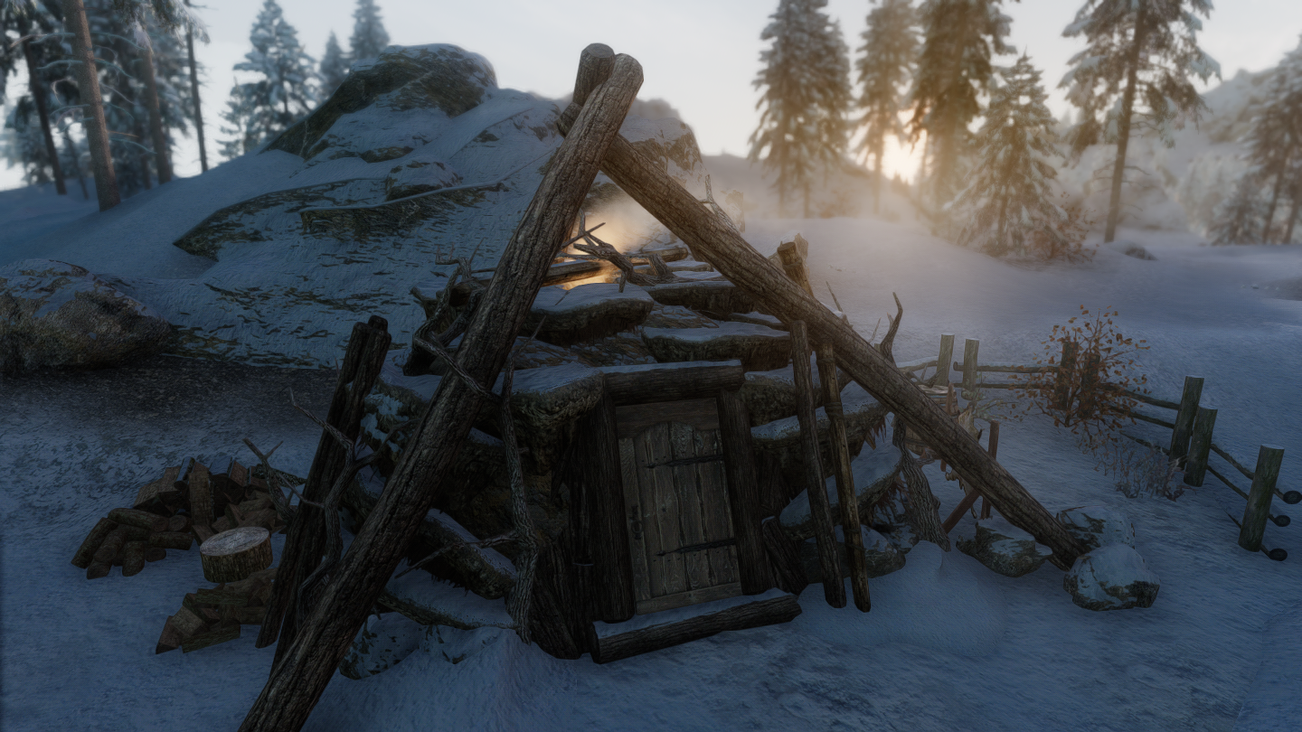 モーサルとドーンスターの中間付近にある雪原に、少人数向けの家を追加するMODです。生活に必要な生産設備の他、火に関する仕掛けもあり、暖かさが感じられる丸太小屋になっています。