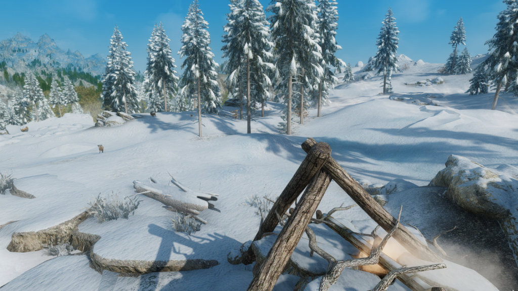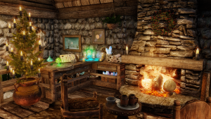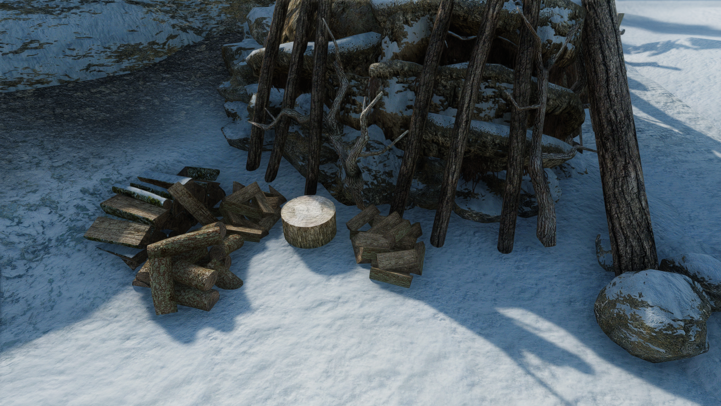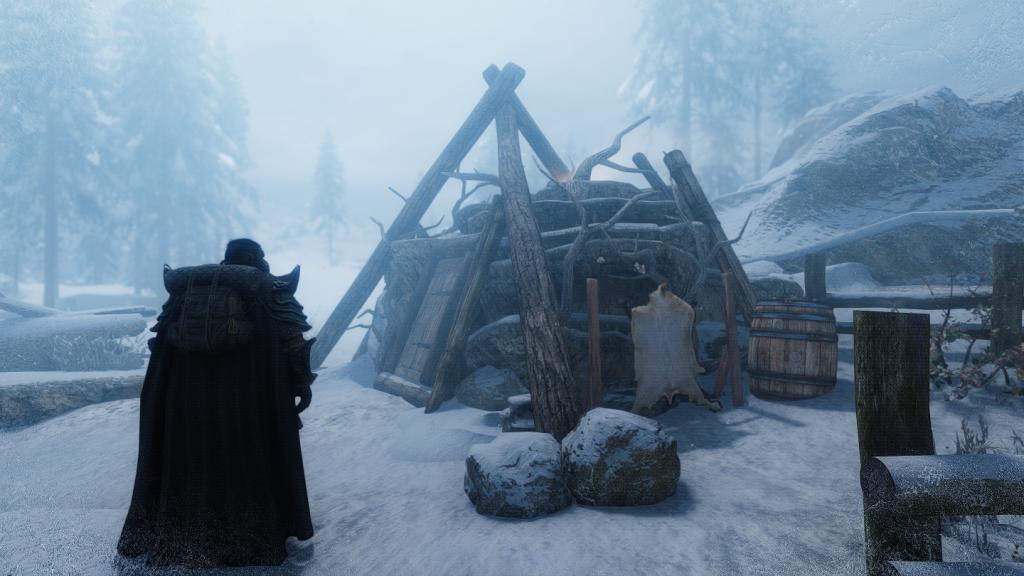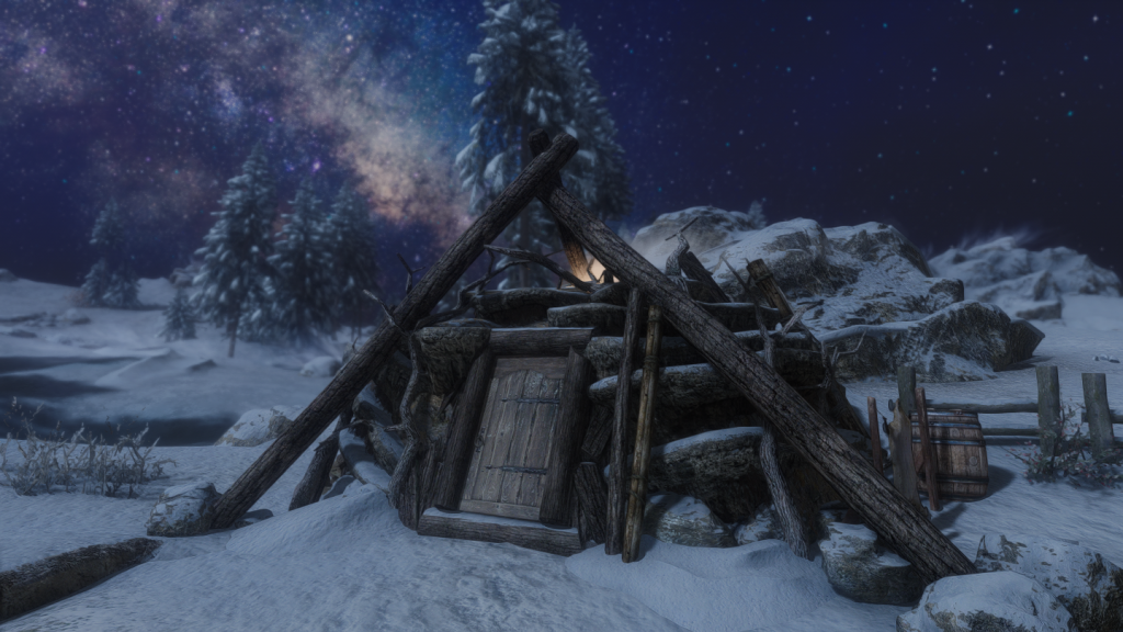 モーサルとドーンスターの中間付近にある雪原に、少人数向けの家を追加するMODです。生活に必要な生産設備の他、火に関する仕掛けもあり、暖かさが感じられる丸太小屋になっています。