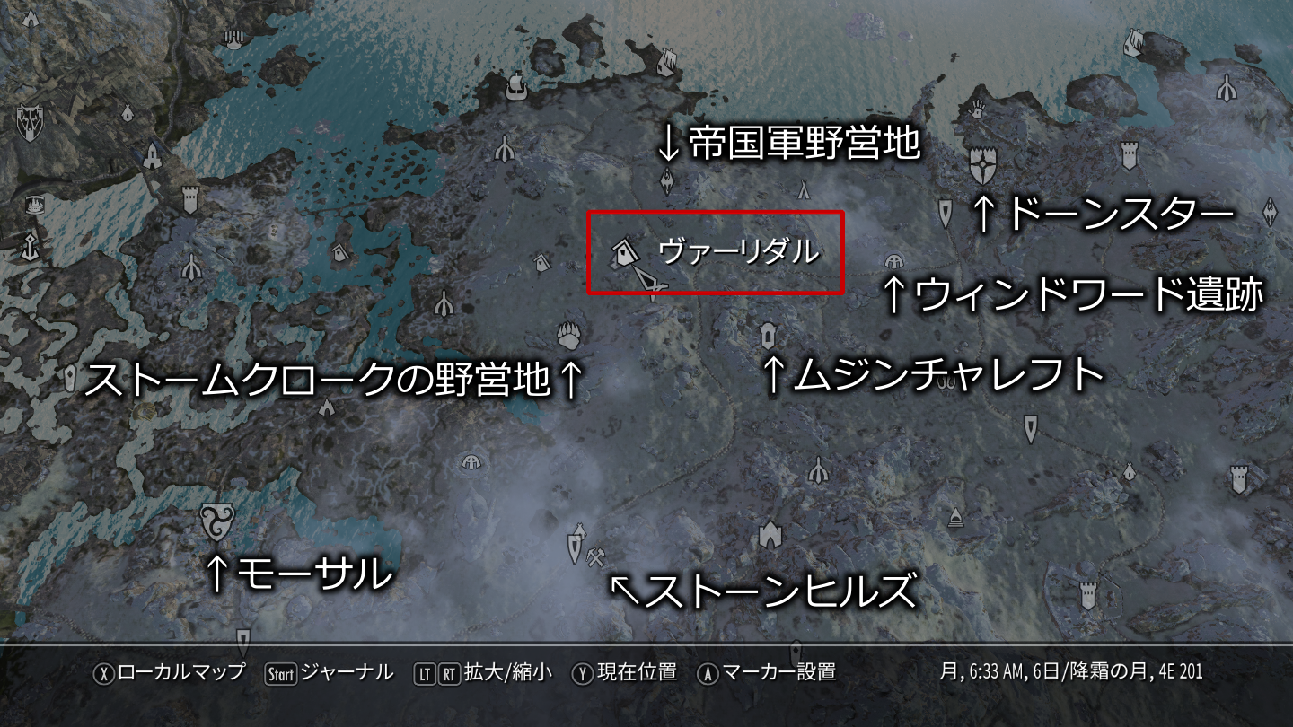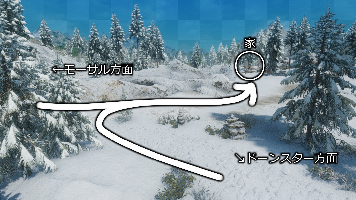 MOD導入直後はマップマーカーが表示されていないので、初回は現地へ向かう必要があります。家はモーサルとドーンスターの間辺りです。