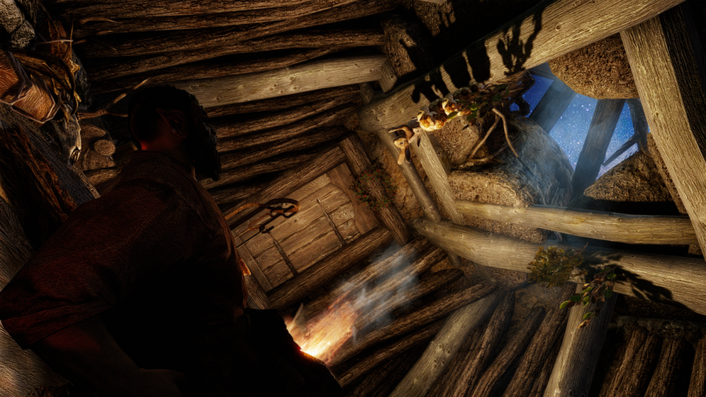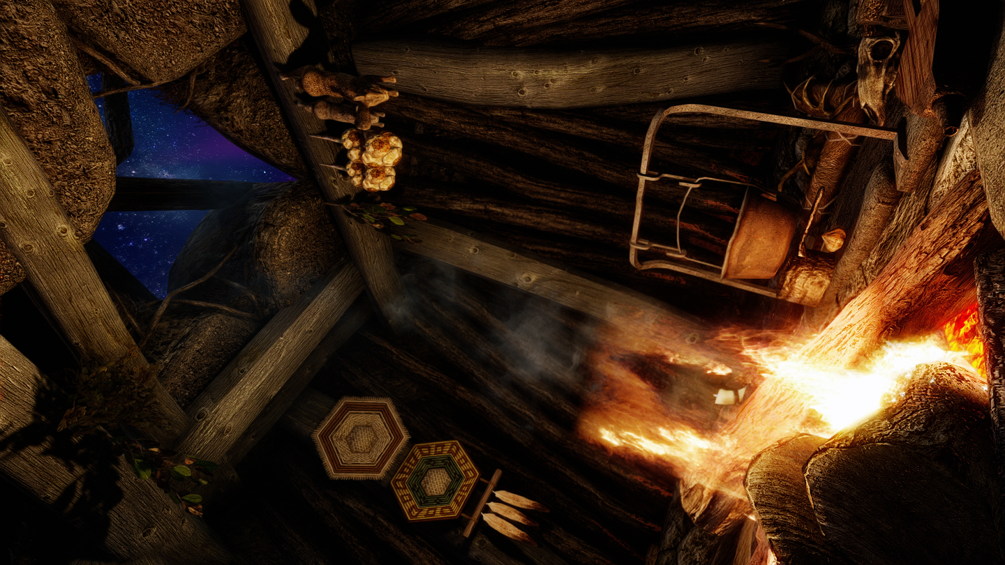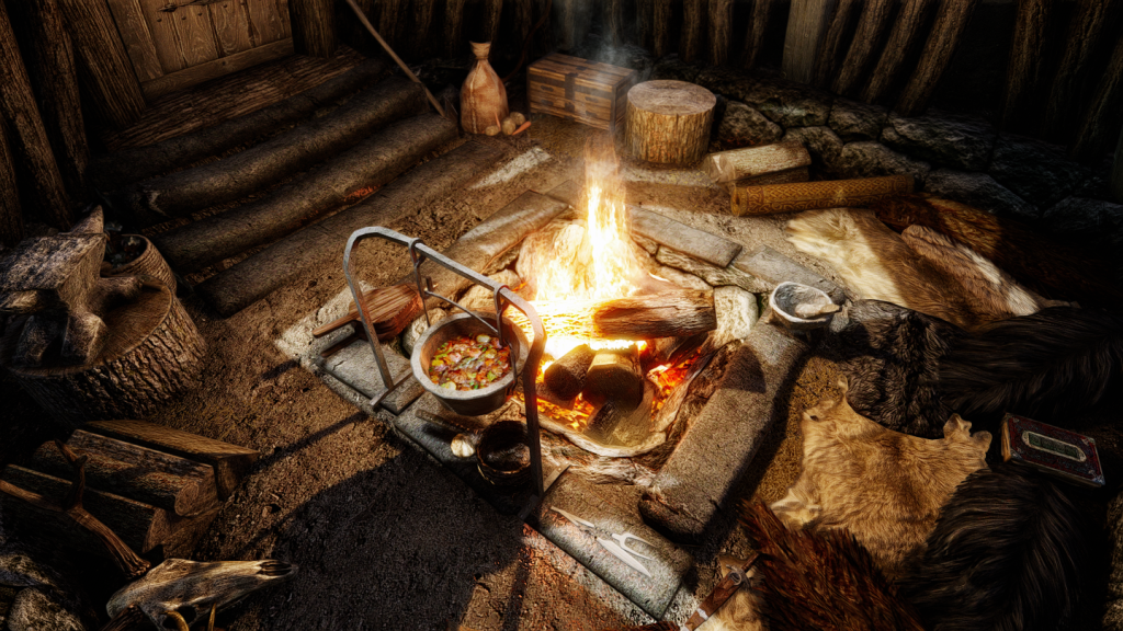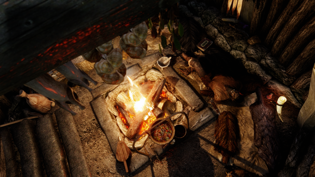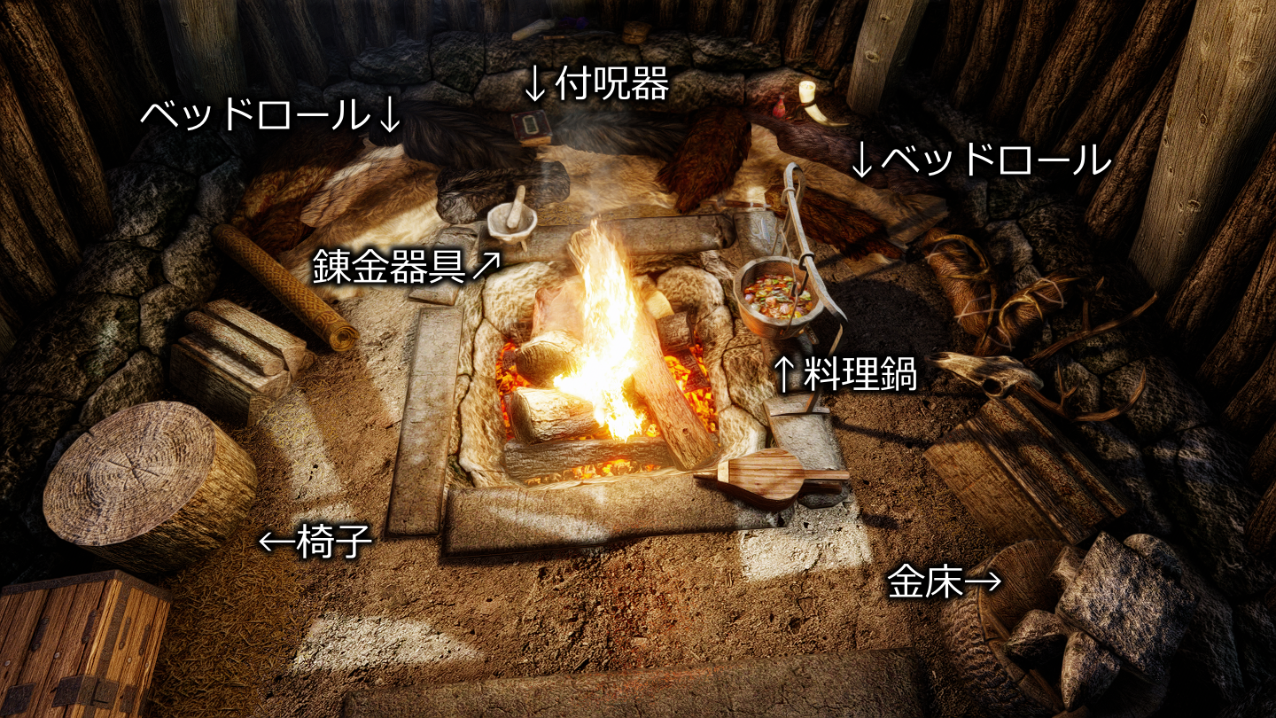 こちらのお家は、北欧のサーミ人の伝統的な移動式住居である「コタ」をベースに、TES風のアレンジを加えたものとのこと。コタも本MODの家と同様、料理と暖房の機能を兼ねて部屋の中心に焚き火を置いていたようです。