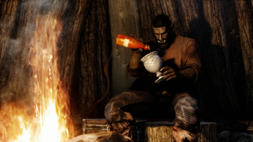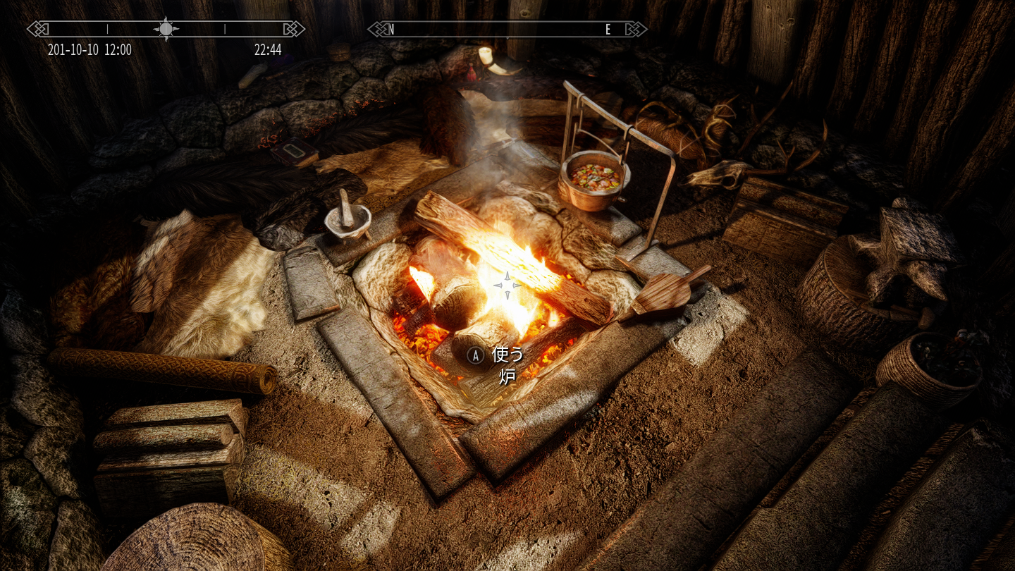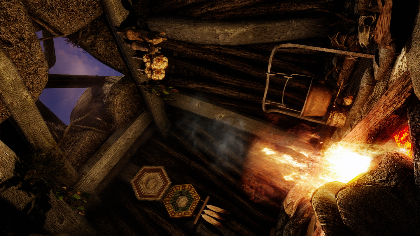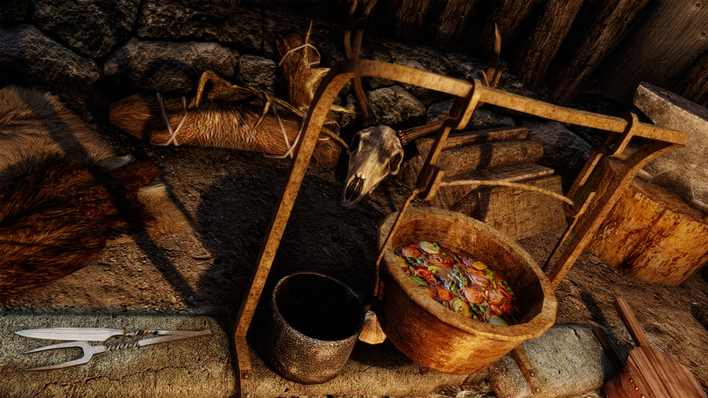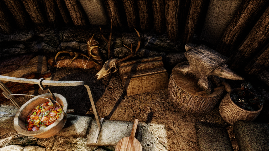 こちらのお家は、北欧のサーミ人の伝統的な移動式住居である「コタ」をベースに、TES風のアレンジを加えたものとのこと。コタも本MODの家と同様、料理と暖房の機能を兼ねて部屋の中心に焚き火を置いていたようです。