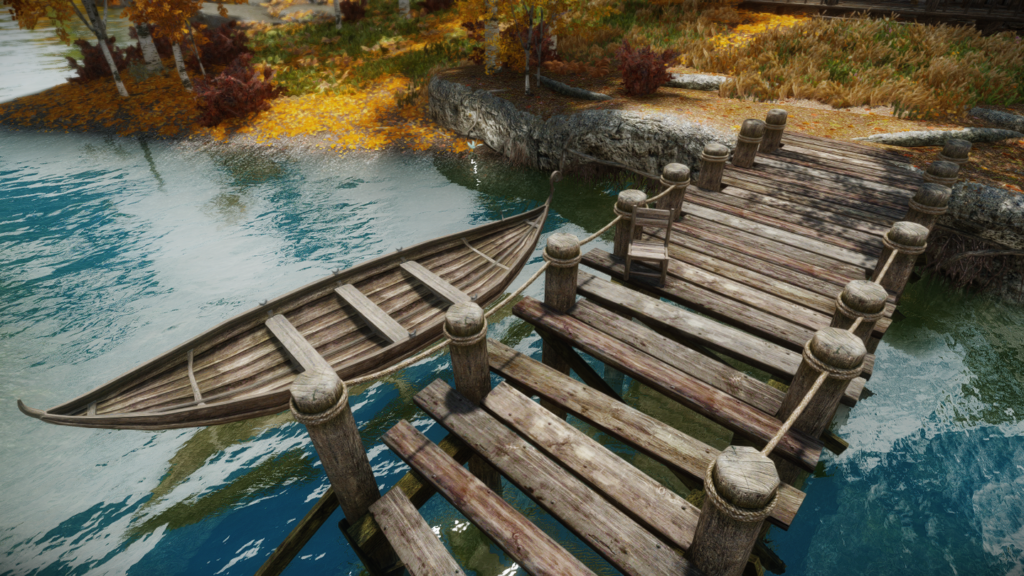 家の前の桟橋には、釣りが楽しめそうなボートや椅子も用意されています。ハートウッド工場も見えますね。