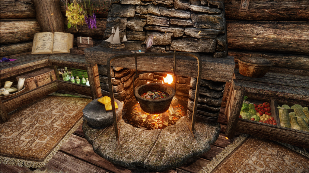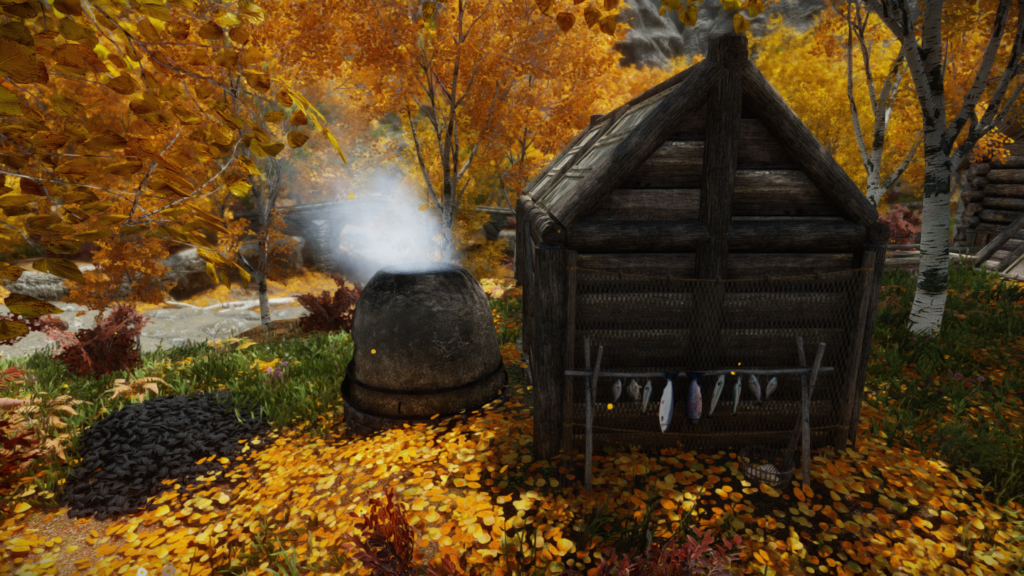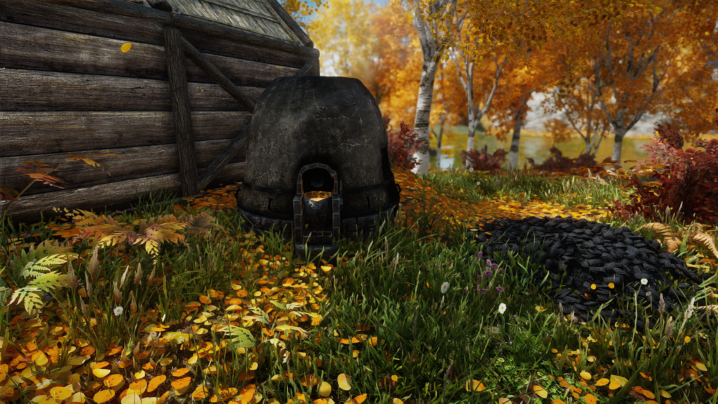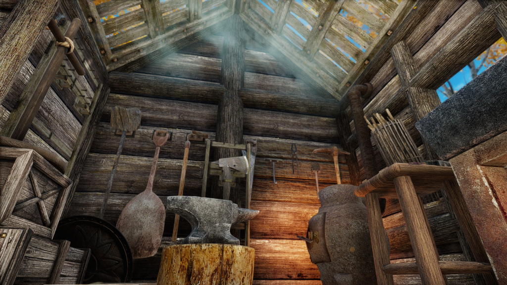 金床や溶鉱炉、料理鍋など、薪を消費することで使用できるようになる設備が屋内外にいくつかあります。火を灯している間は小屋や家の煙突からさりげなく煙や炎が出るという細かな仕掛けも。