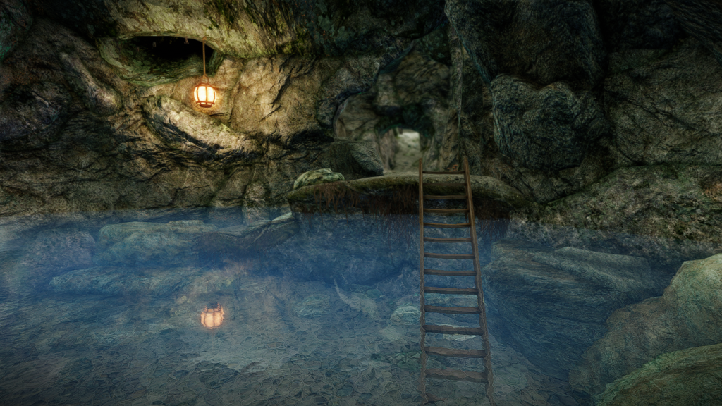 ロードを挟んだ先に広くて深い地下泉があります。浅いところやくつろげそうなスペースも用意されているので、座ったり寝そべっているポーズでSS撮影もできます。