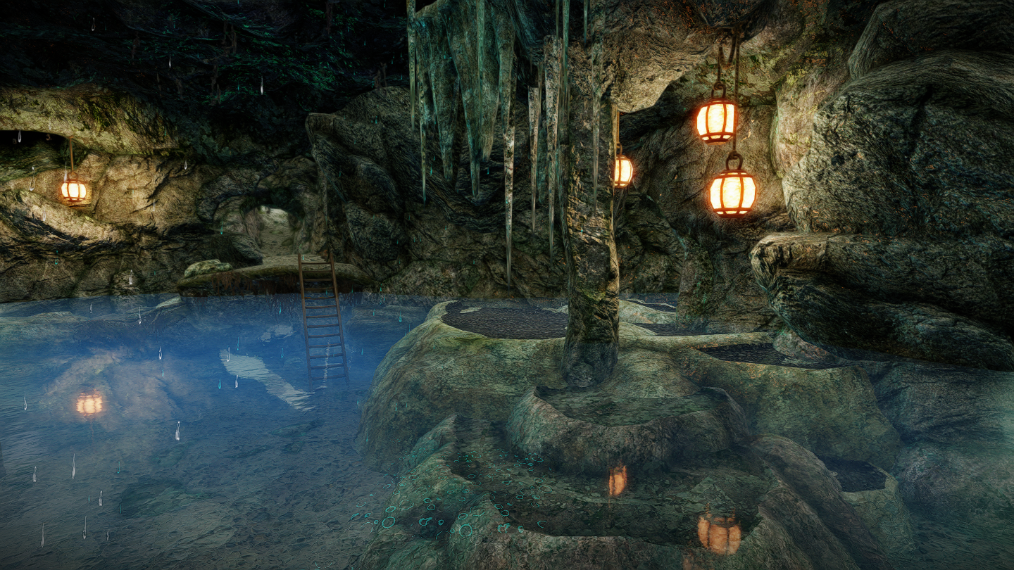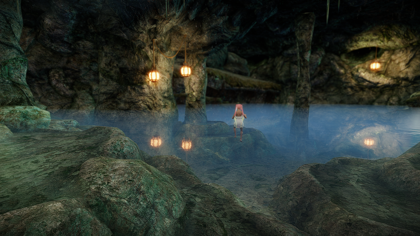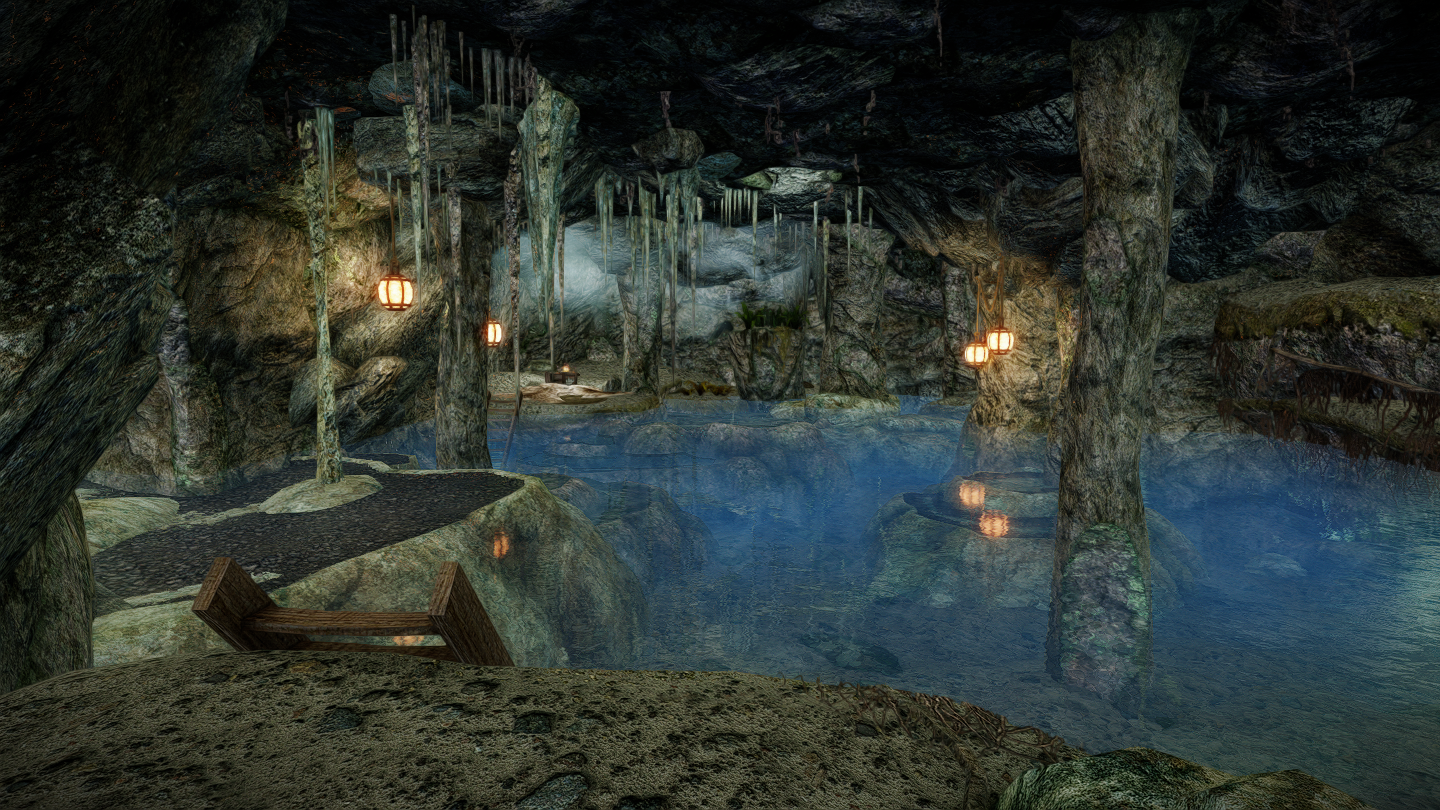 ロードを挟んだ先に広くて深い地下泉があります。浅いところやくつろげそうなスペースも用意されているので、座ったり寝そべっているポーズでSS撮影もできます。