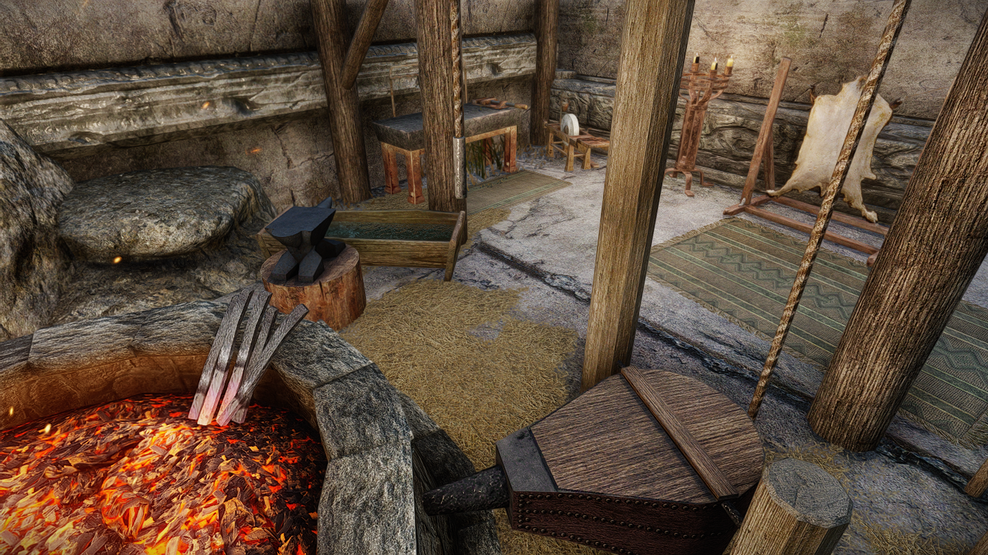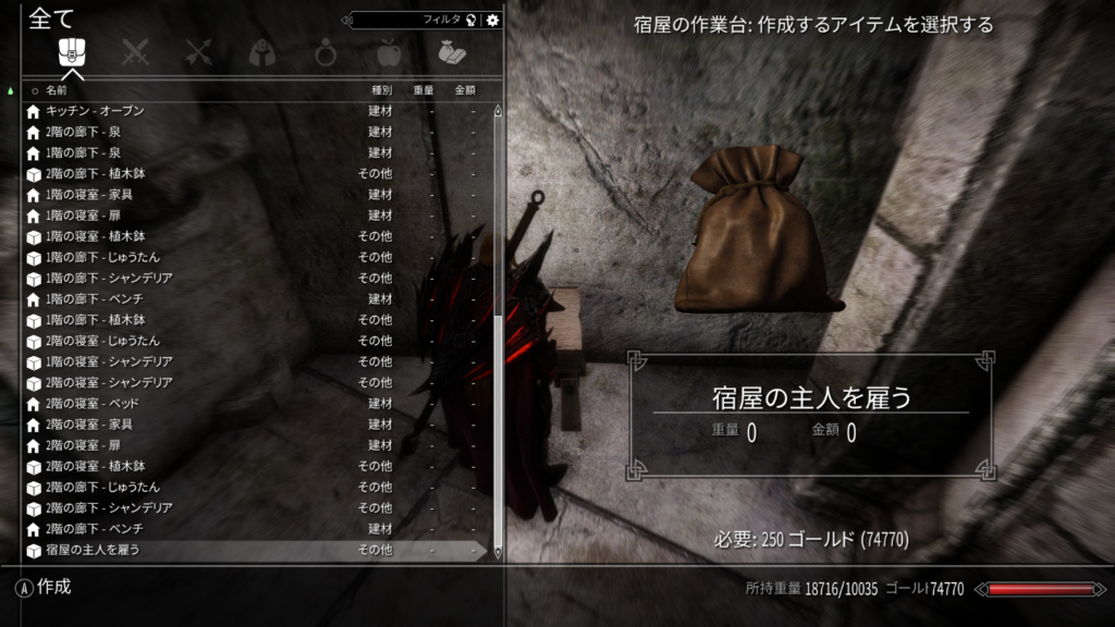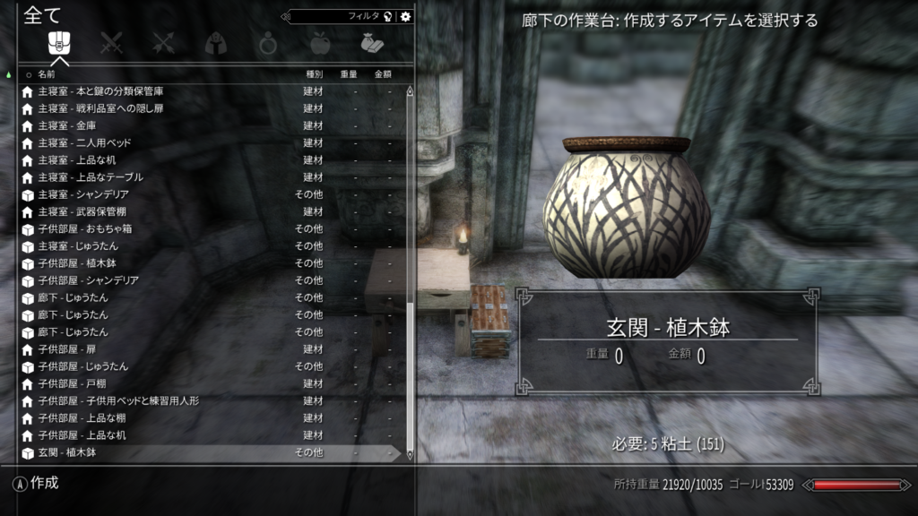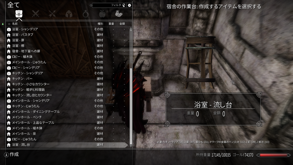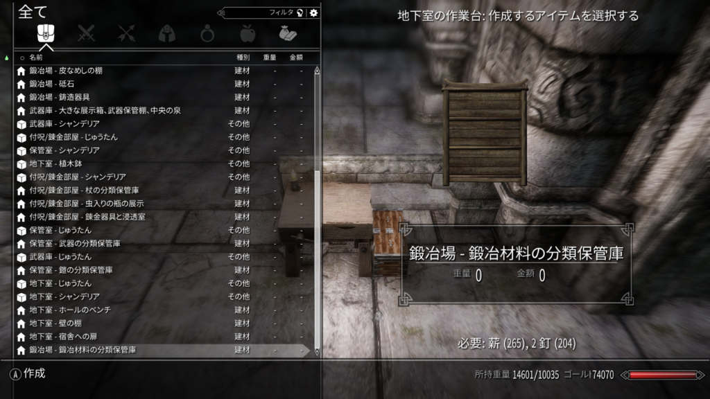 - 地下室:作業台/溶鉱炉/鋳造器具/皮なめしの棚/錬金器具/浸透室/付呪器/杖用の付呪器/マネキン