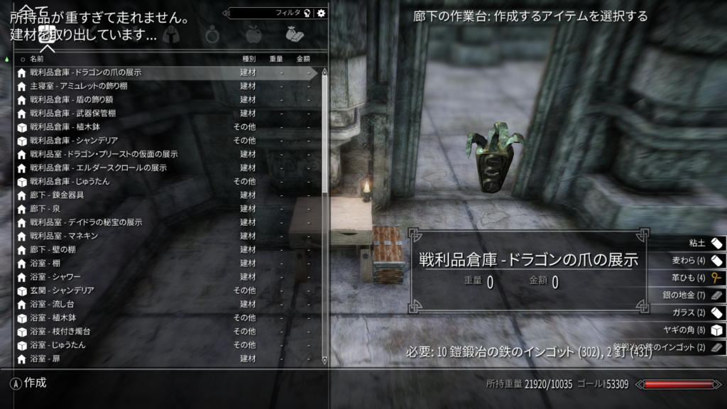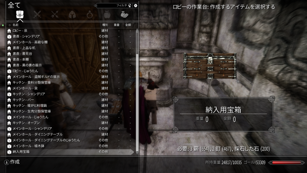 素材を入れておいて装備を作成する際に取り出したり、重量がある戦利品を保管して別の部屋に飾る際に取り出したりなど、いろんな活用法がありそうです。