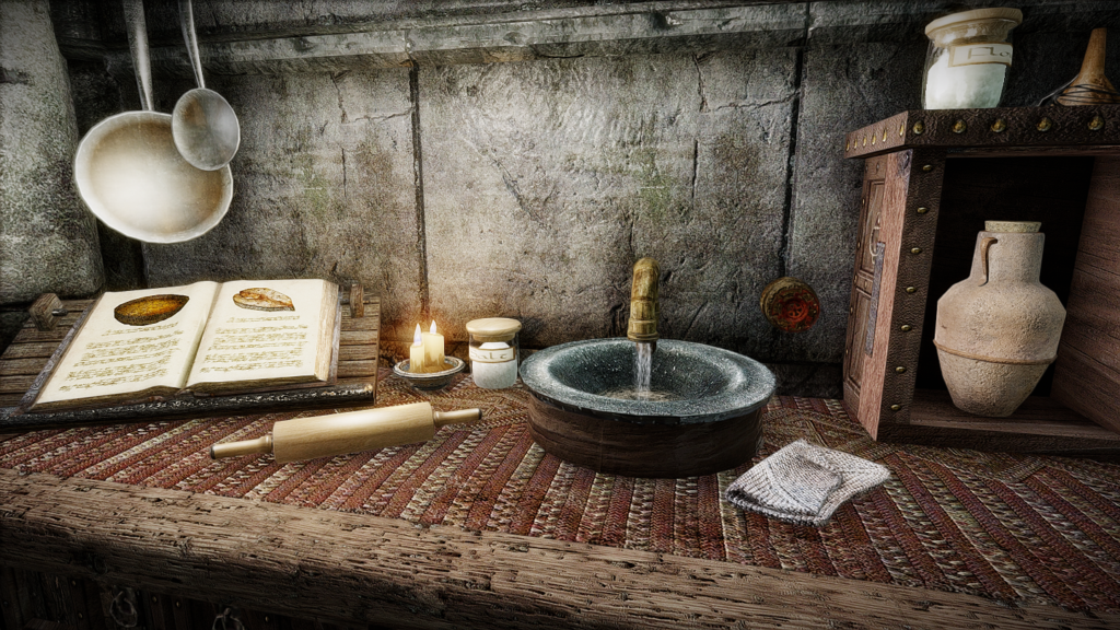 おま環かもしれませんが、リビングにあるバスケットの表示がおかしい場合、該当のメッシュファイルを「SSE NIF Optimizer」などで変換・上書きすると解消するかもしれません。