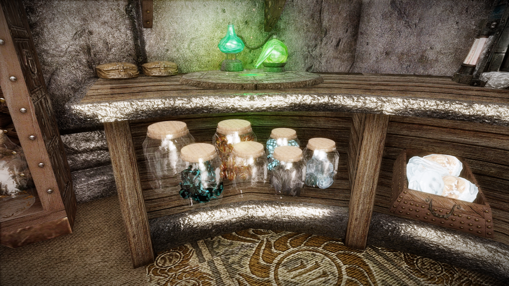 錬金器具や付呪器の近くに、ホタルの瓶などを飾れる棚もあります。画像でもさりげなく飾っています。