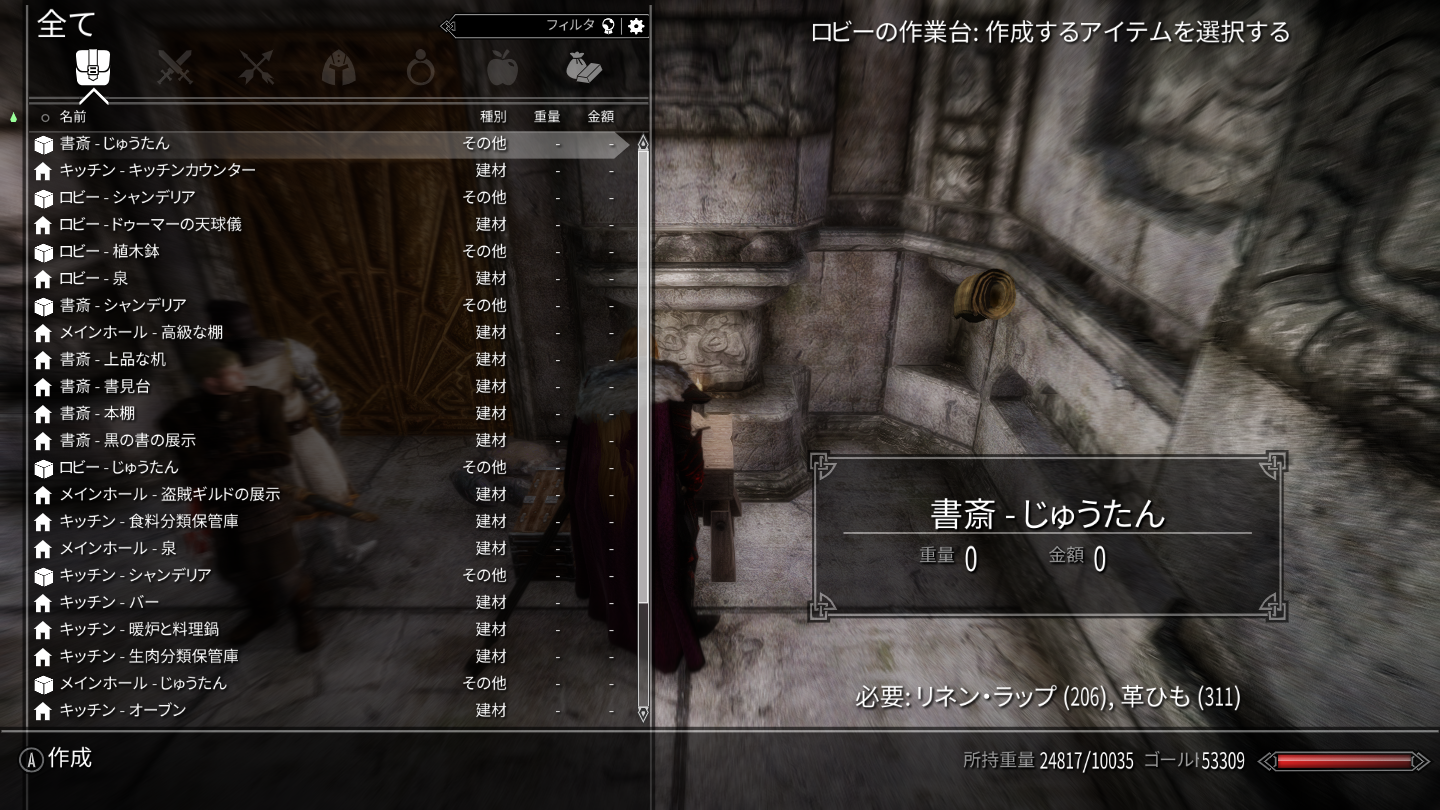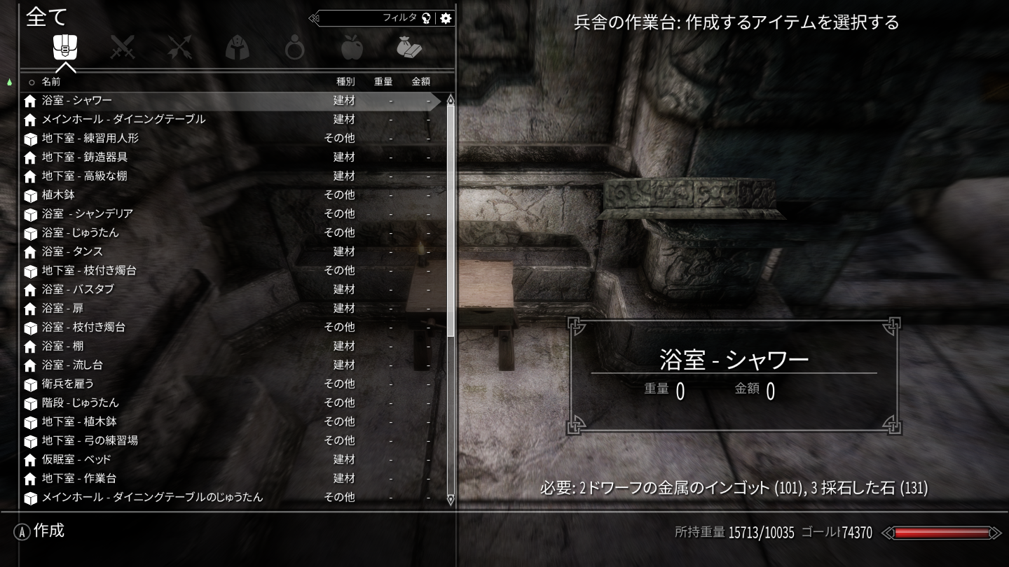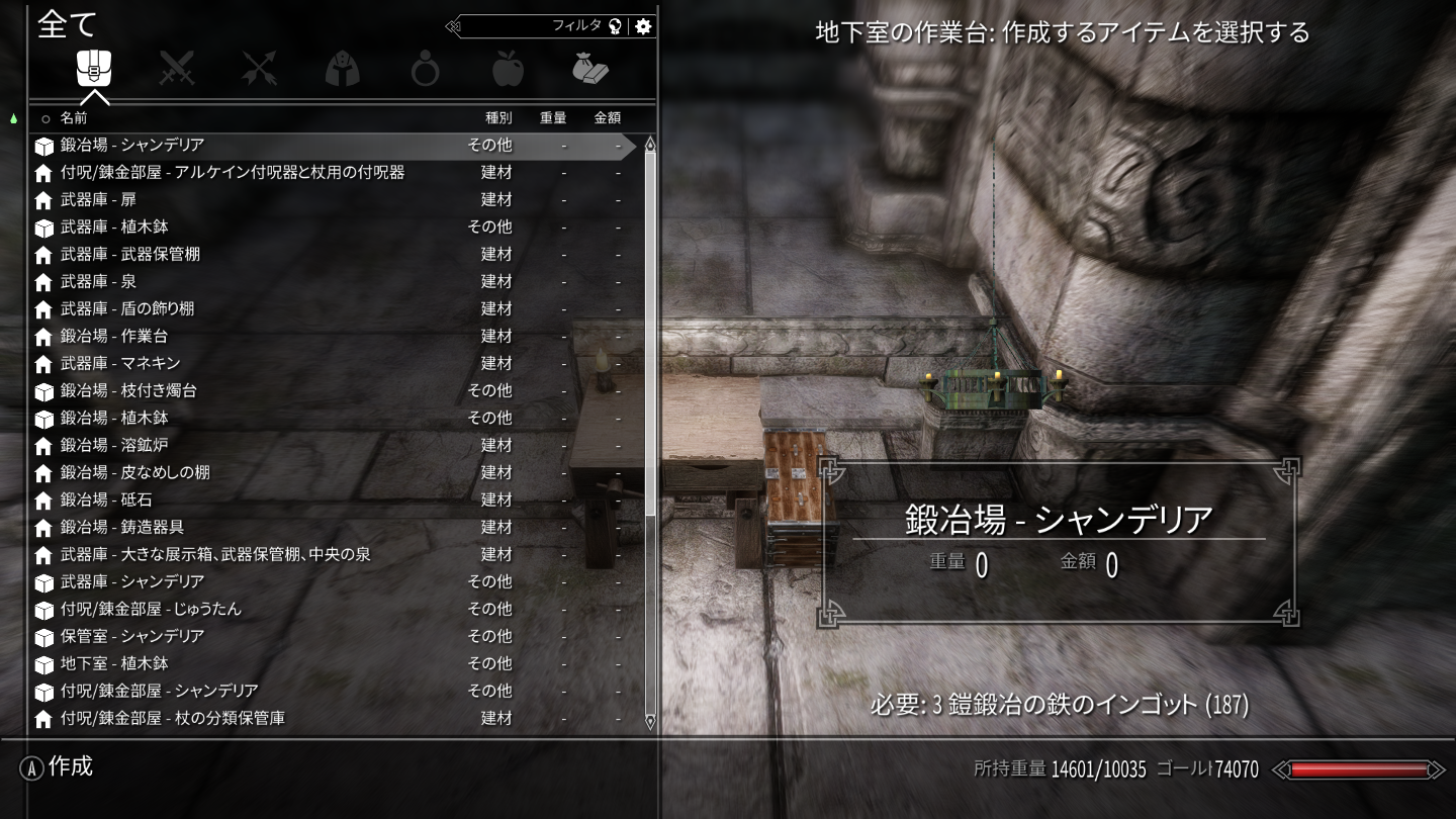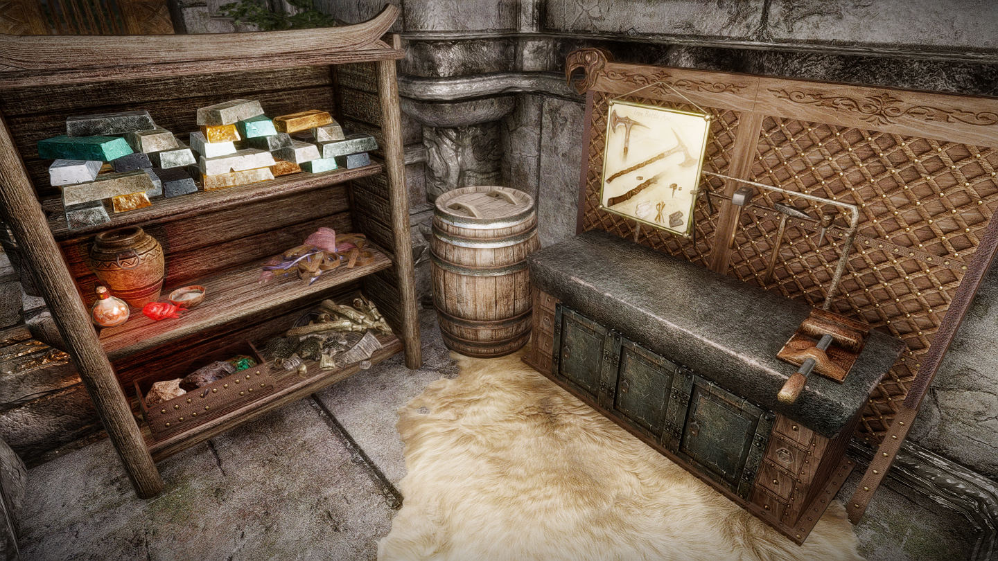 - 地下室:作業台/溶鉱炉/鋳造器具/皮なめしの棚/錬金器具/浸透室/付呪器/杖用の付呪器/マネキン