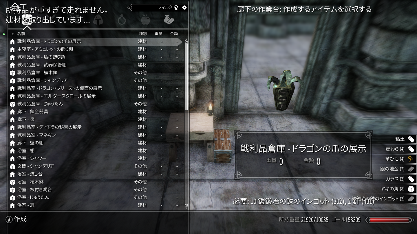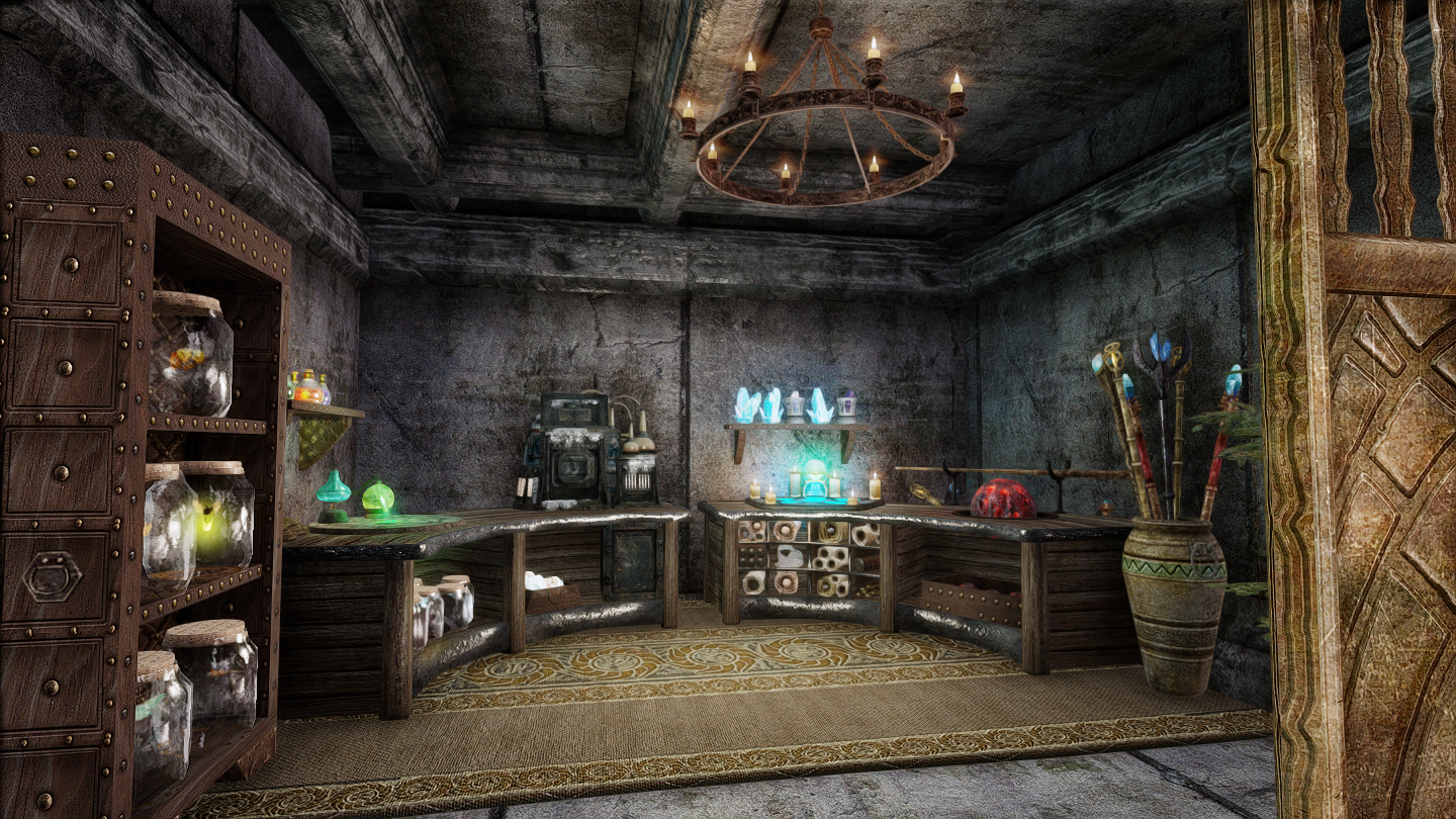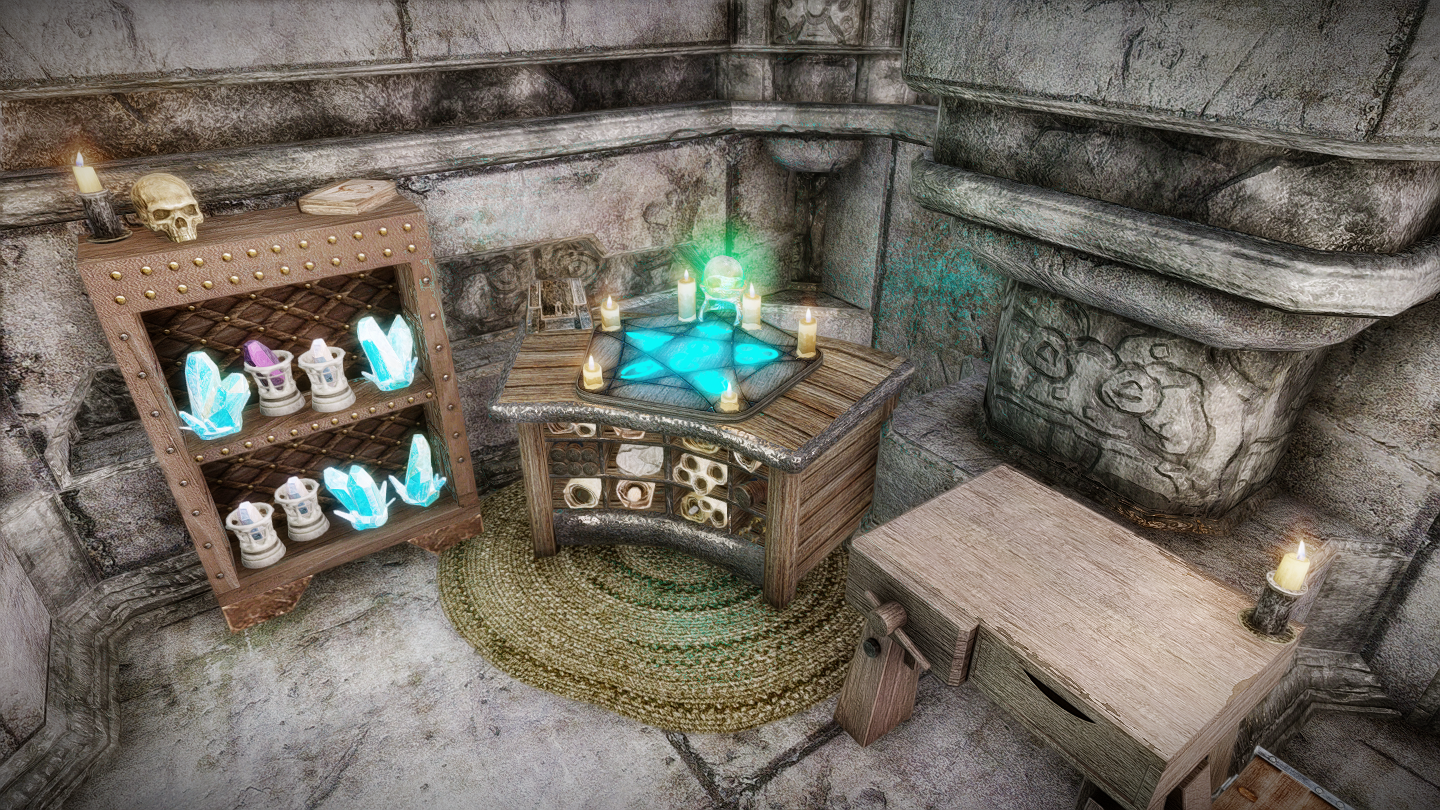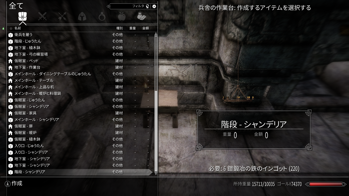- 地下室:作業台/溶鉱炉/鋳造器具/皮なめしの棚/錬金器具/浸透室/付呪器/杖用の付呪器/マネキン