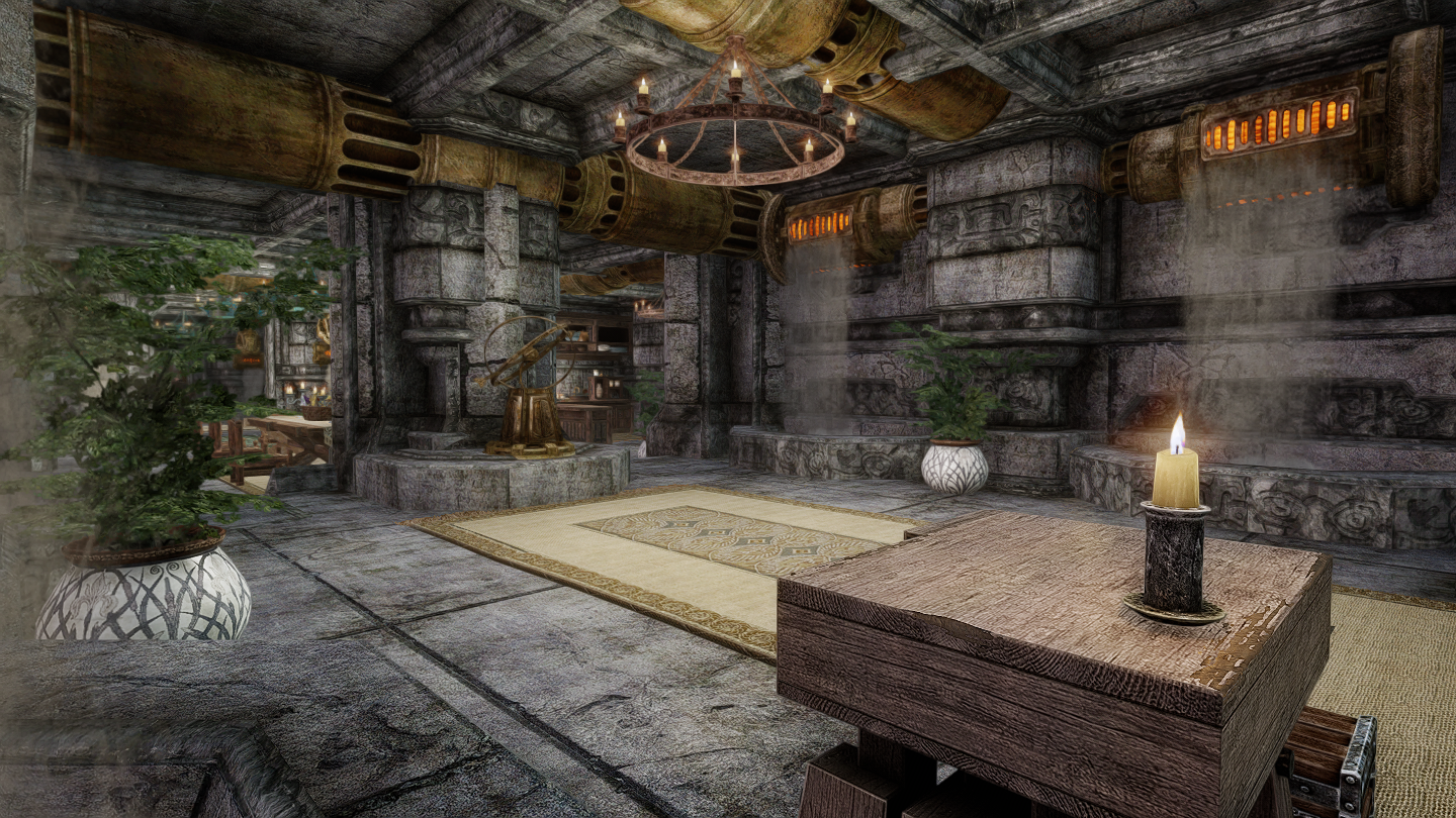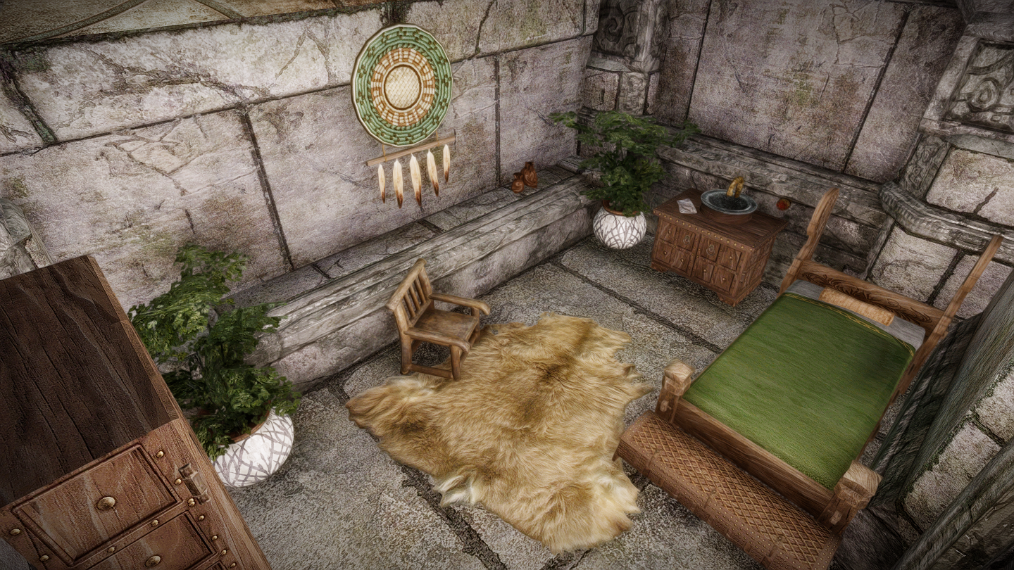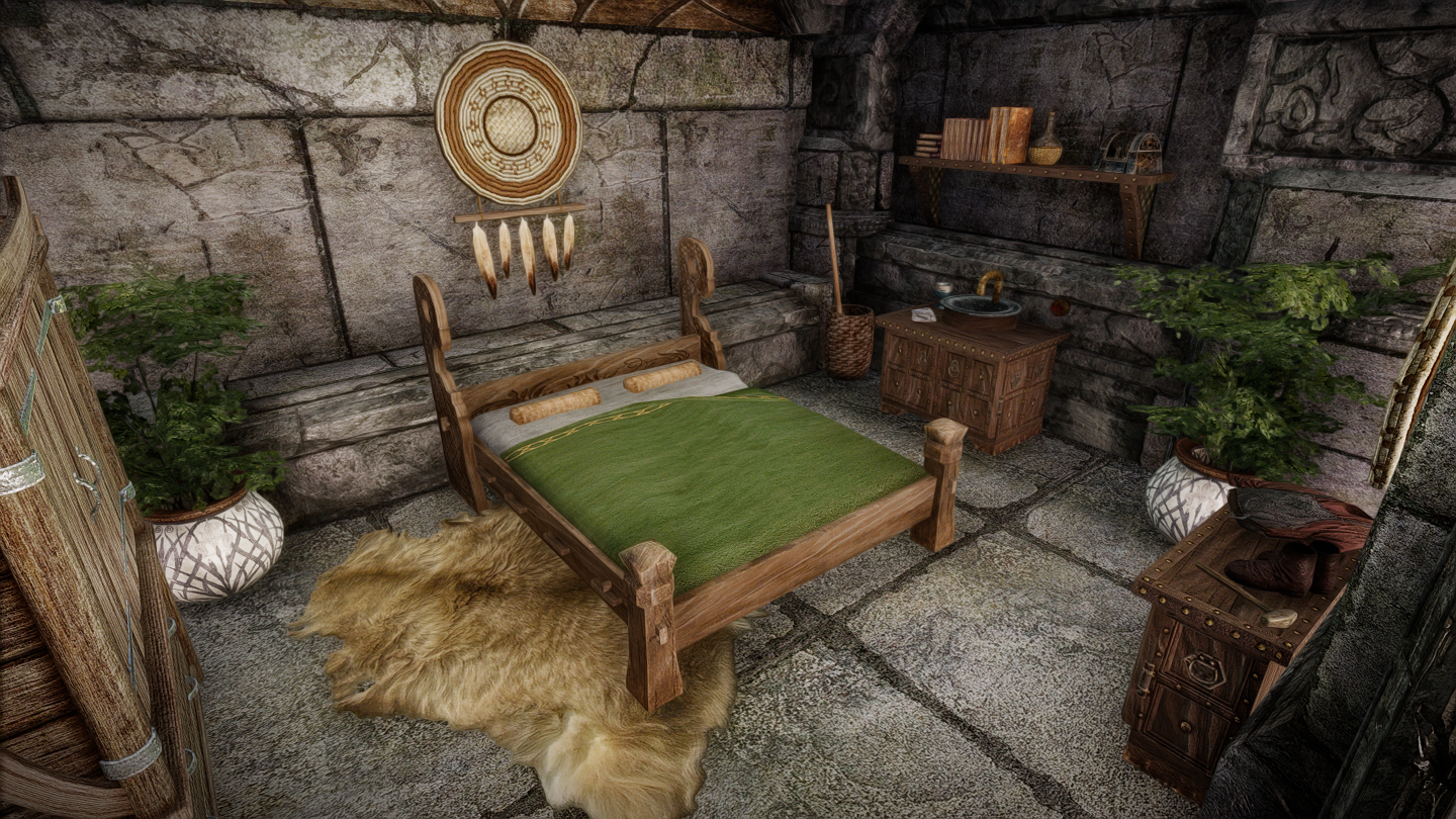 おま環かもしれませんが、リビングにあるバスケットの表示がおかしい場合、該当のメッシュファイルを「SSE NIF Optimizer」などで変換・上書きすると解消するかもしれません。