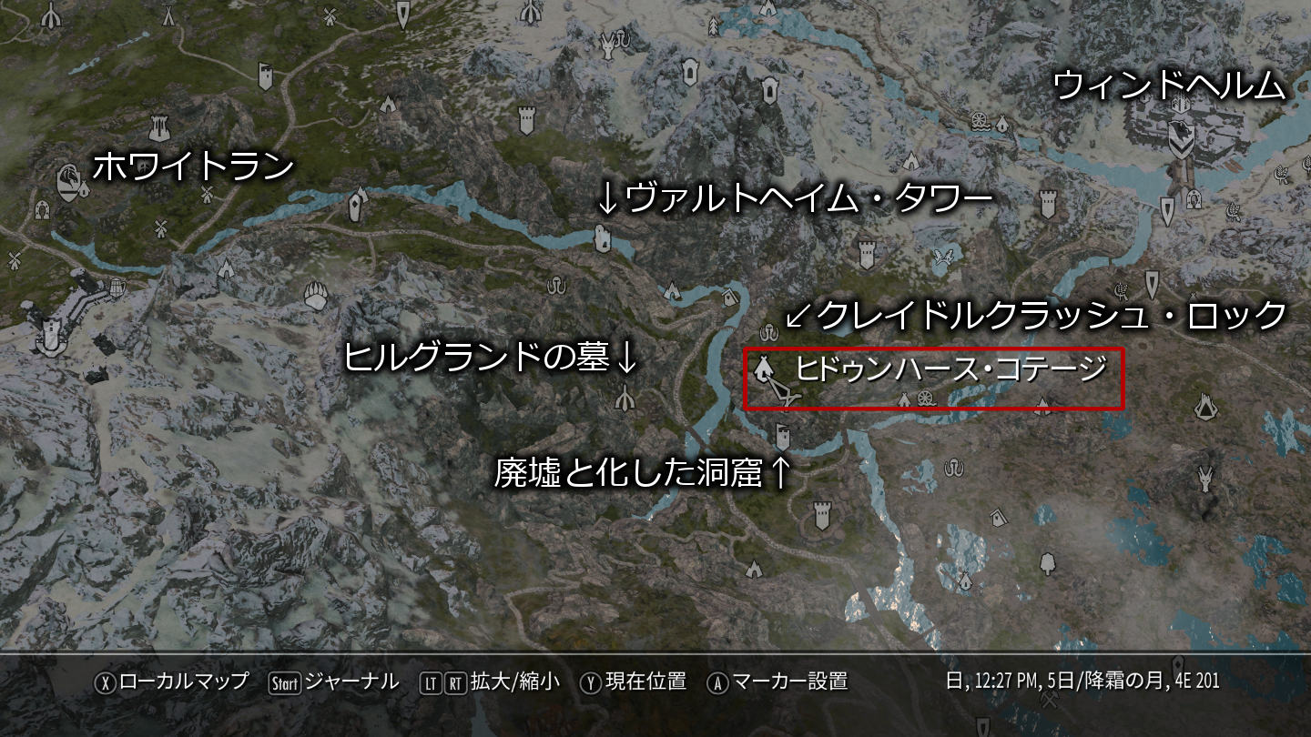 徒歩でお越しの際は、ホワイトラン~ウィンドヘルム間にある各ロケーションを目指して川沿いに歩き、どこかで川を渡る感じになりそうです。家はクレイドルクラッシュロックの近くにあります。