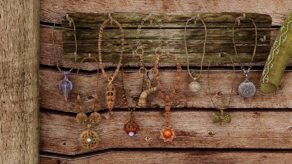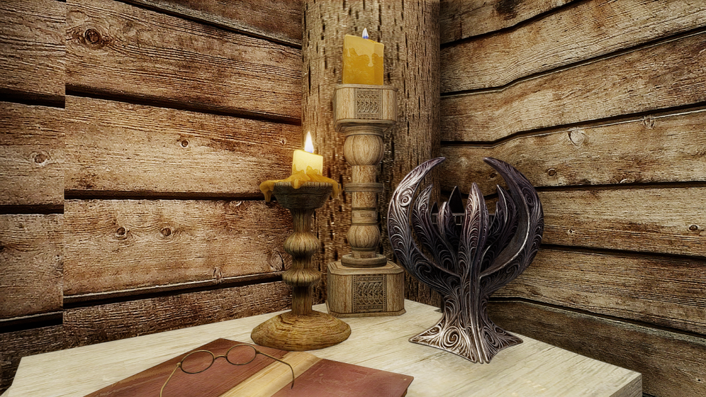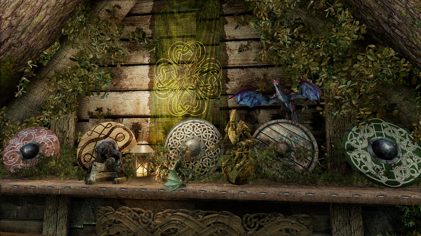 実際に飾ってみました。デイドラ系アーティファクトだけでなく、盗賊ギルドクエストで集められるお宝や各ホールドの衛兵の盾も飾れるようになっています。