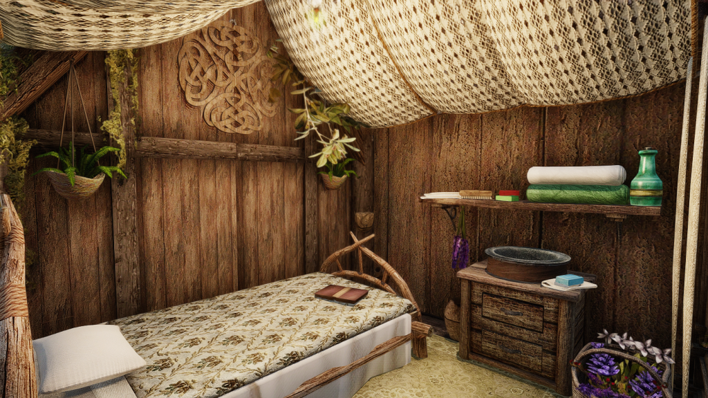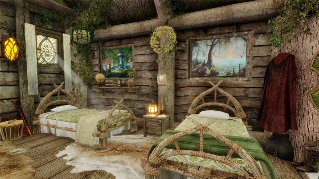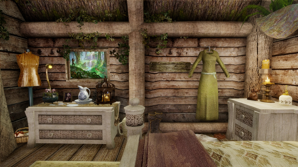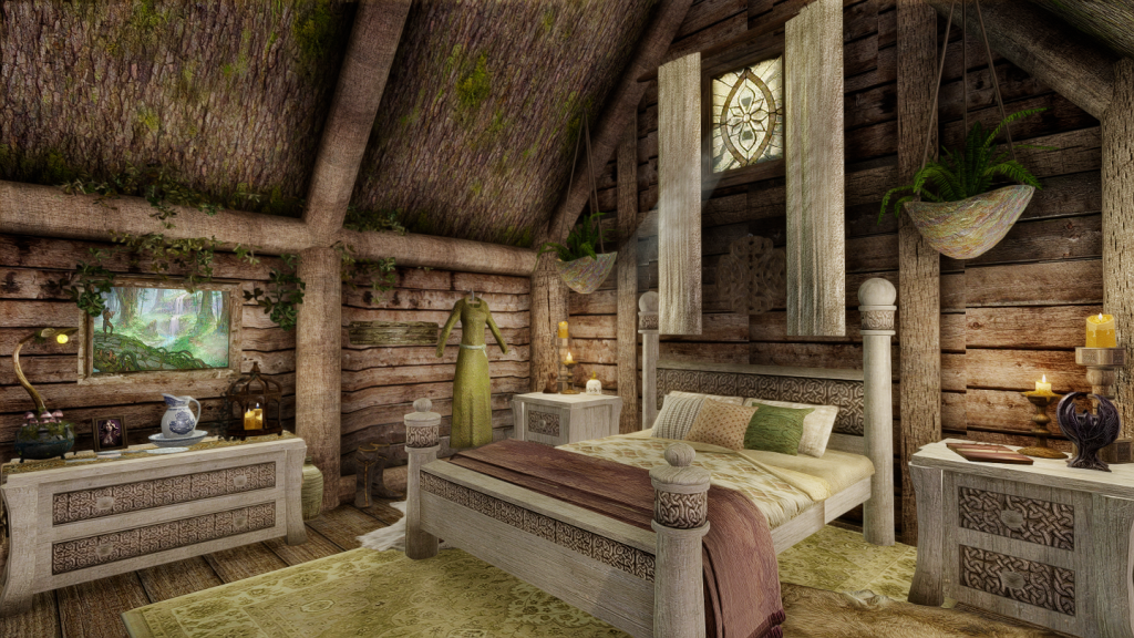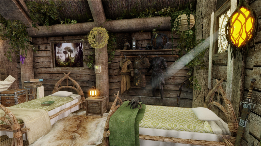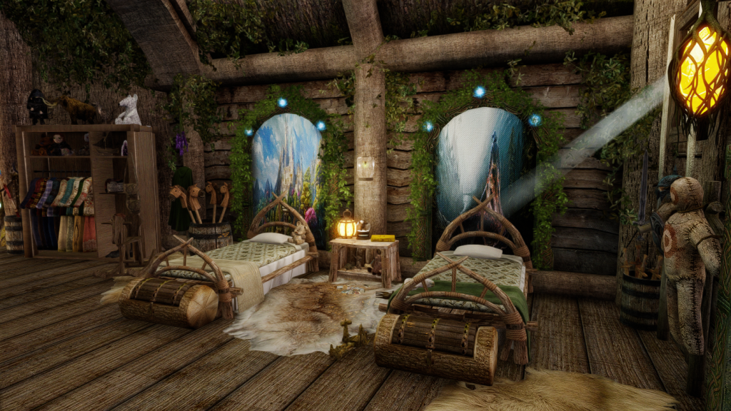 フォロワー用ベッドがある、Follower Editionの画像です。近くにはハチミツ酒を入手できるセラーのような棚も。