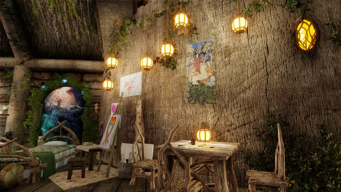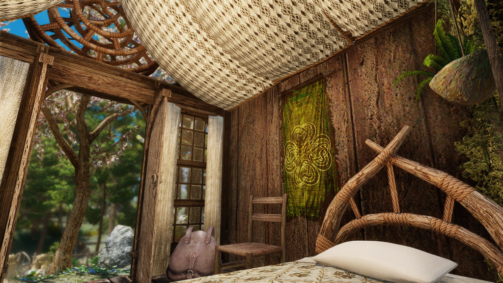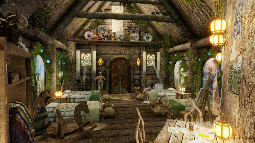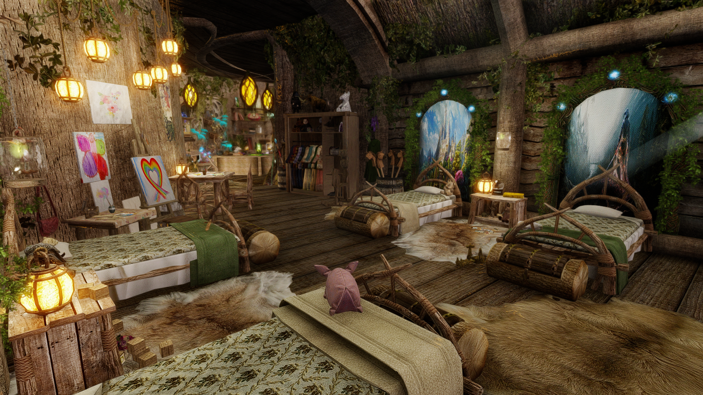 フォロワー用ベッドがある、Follower Editionの画像です。近くにはハチミツ酒を入手できるセラーのような棚も。