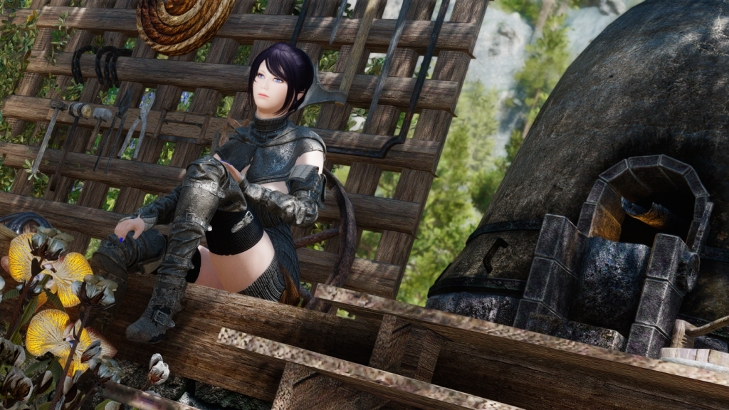 鍛冶スペース:砥石/作業台/皮なめしの棚/鋳造器具/溶鉱炉/薪割り台