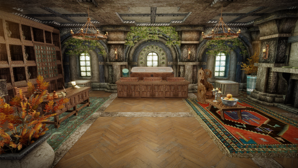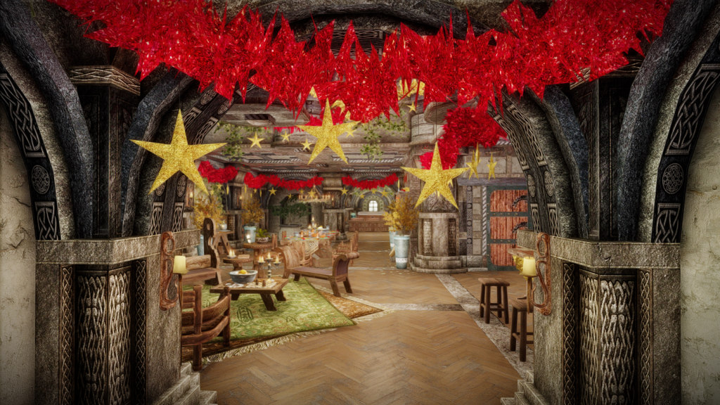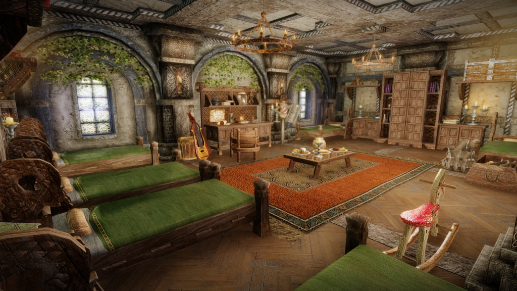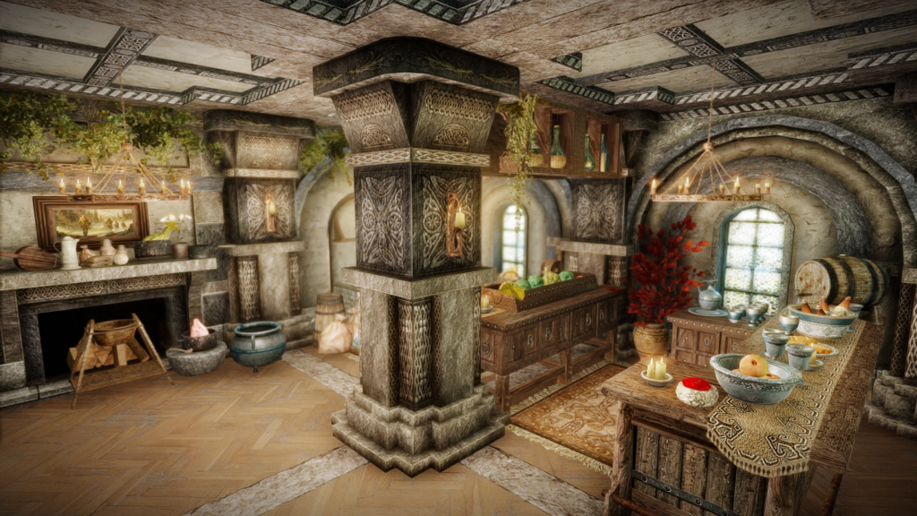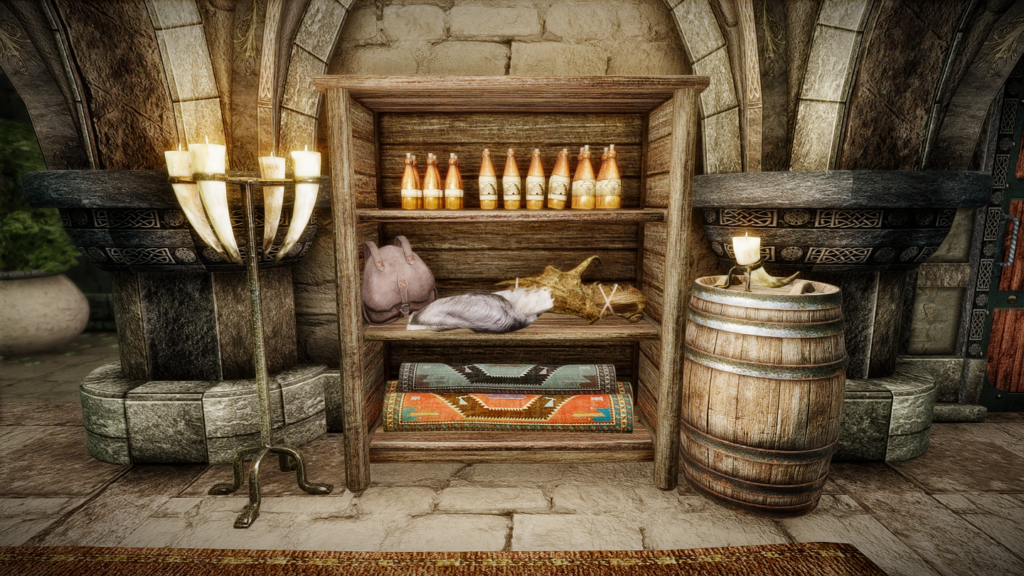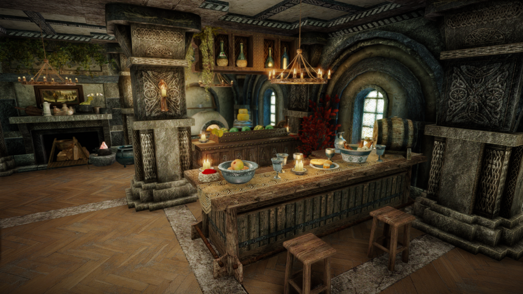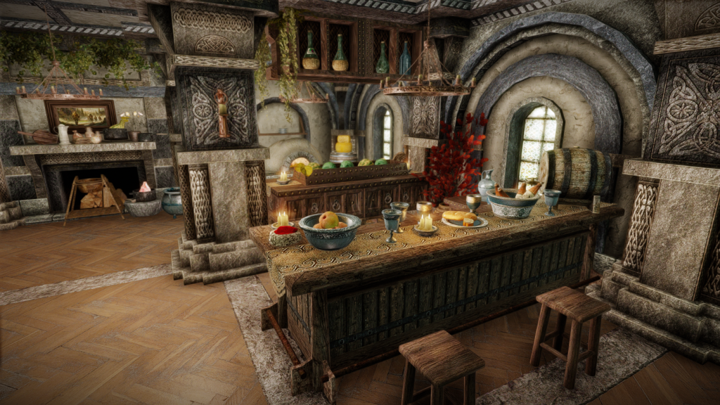 この階にもダイニングのような広間やお風呂があり、家族やフォロワーたちとくつろげるようになっています。ハチミツ酒はホニングブリューとブラック・ブライア両方用意されており、銘柄に拘りがある方も安心です。