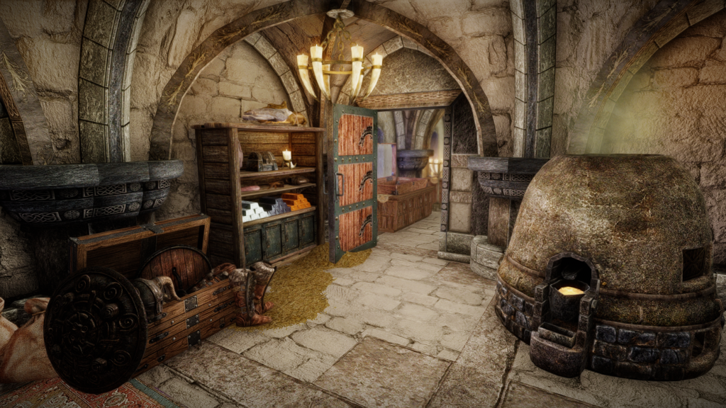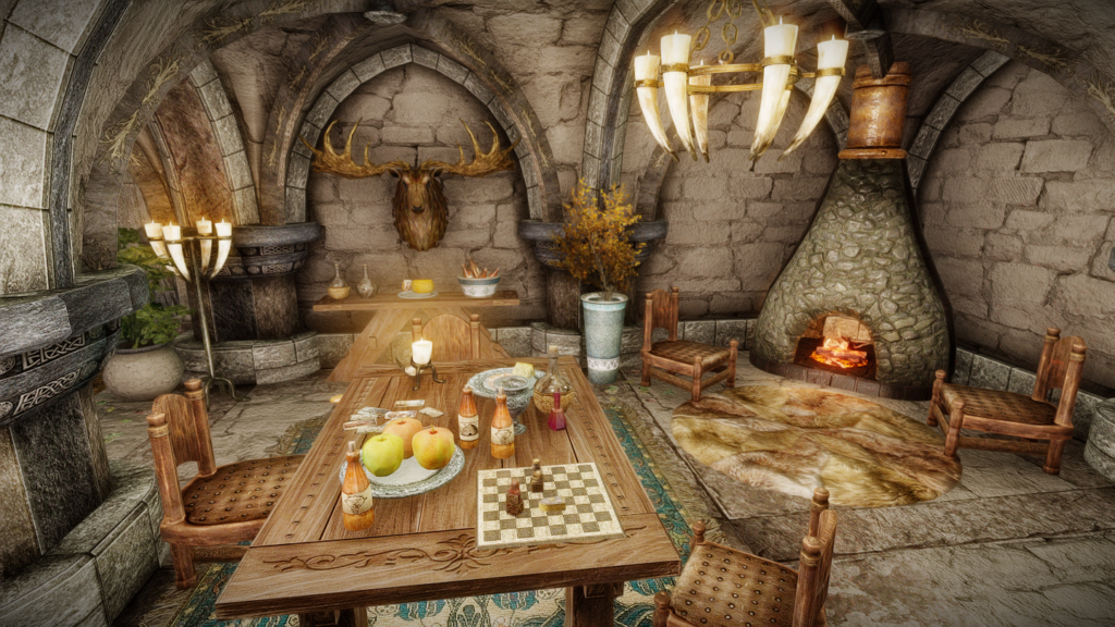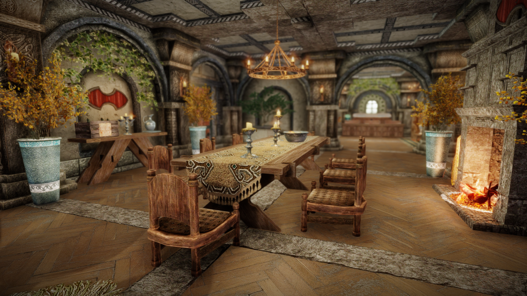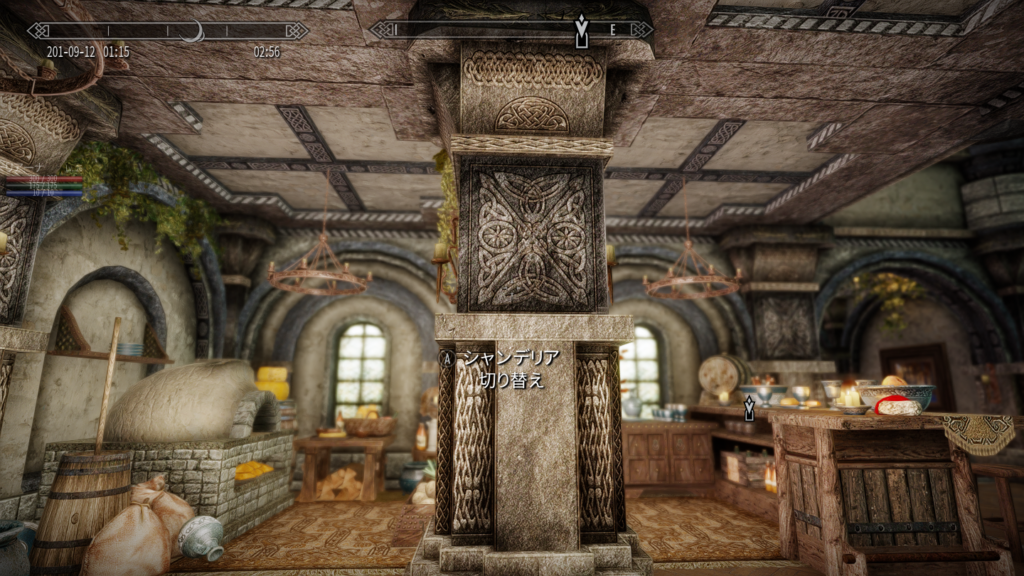 ダイニングの柱(画像1枚目)をアクティベートすると、天井のシャンデリアに火が灯され、室内が明るくなります。