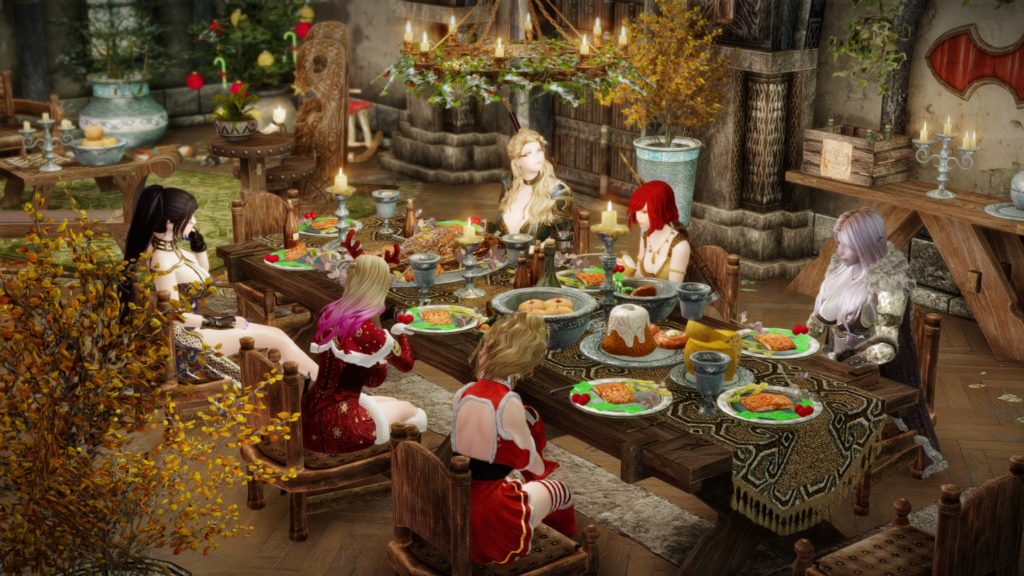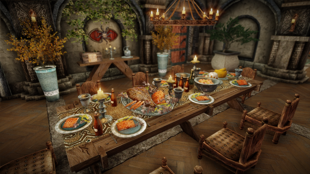 食卓近くの小さなテーブル付近(画像1、3枚目)をアクティベートすると、テーブルの上に食事を配置することができます。片付けたり朝食⇔夕食を切り替える際は2回アクティベートします。