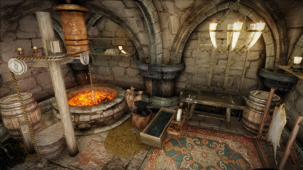 - 作業部屋:溶鉱炉/鋳造器具/砥石/作業台/皮なめしの棚