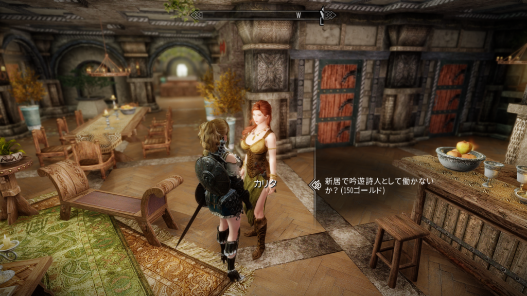 150ゴールドで吟遊詩人を雇うこともできます。画像では試しにカリタさん(ドーンスターの宿屋にいる吟遊詩人)を雇っています。