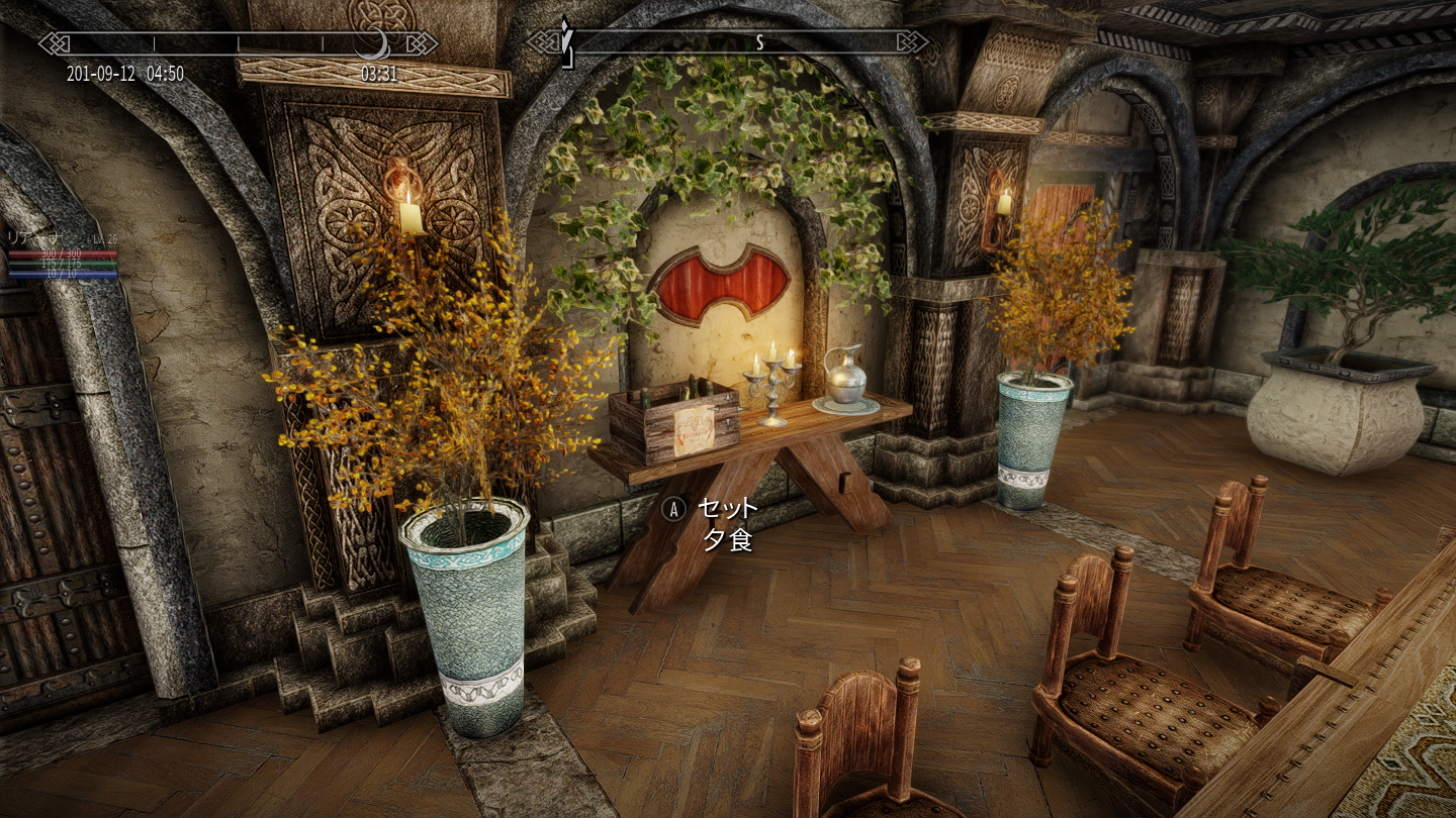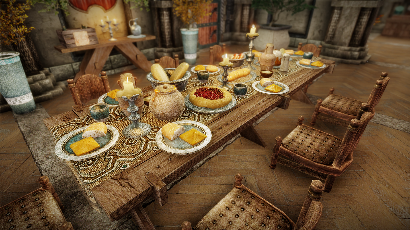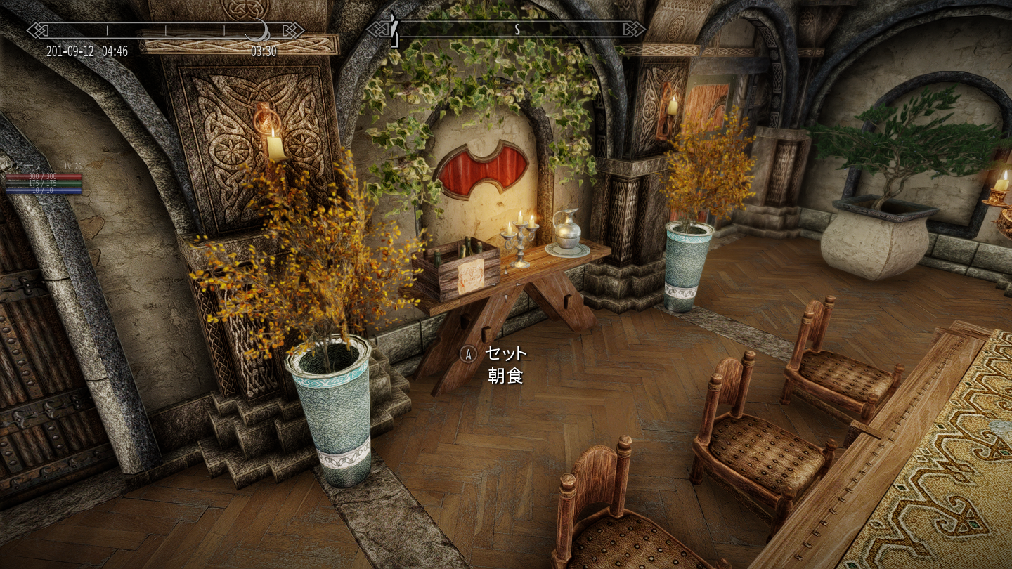 食卓近くの小さなテーブル付近(画像1、3枚目)をアクティベートすると、テーブルの上に食事を配置することができます。片付けたり朝食⇔夕食を切り替える際は2回アクティベートします。