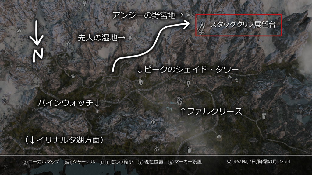 マップマーカーは白いので始めからFT可能です。徒歩で向かう際は、ピークのシェイド・タワーやパインウォッチ近くの道から山を登る感じになりそうです。山道の各所には積み石が置かれており、道標になっています。