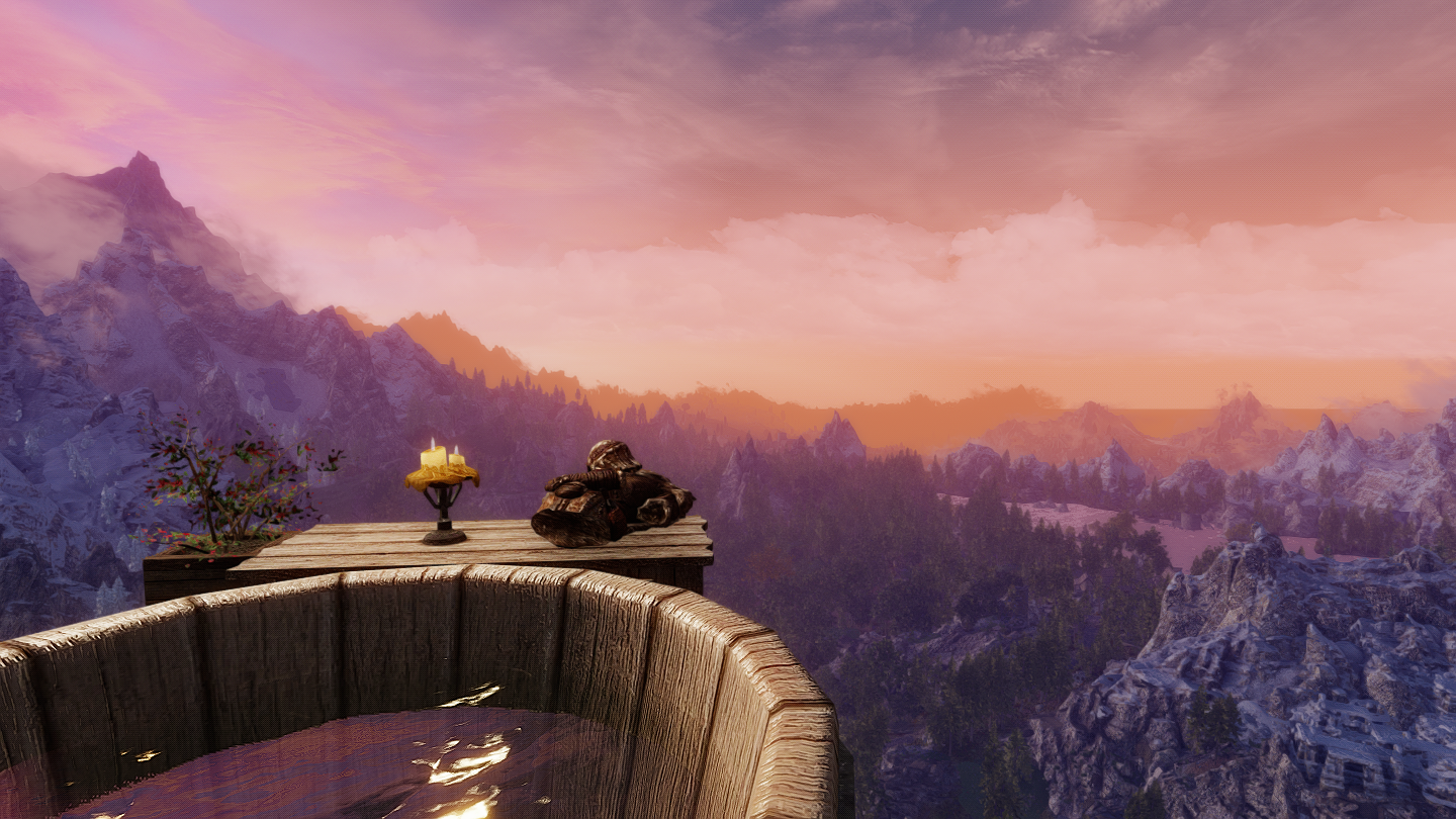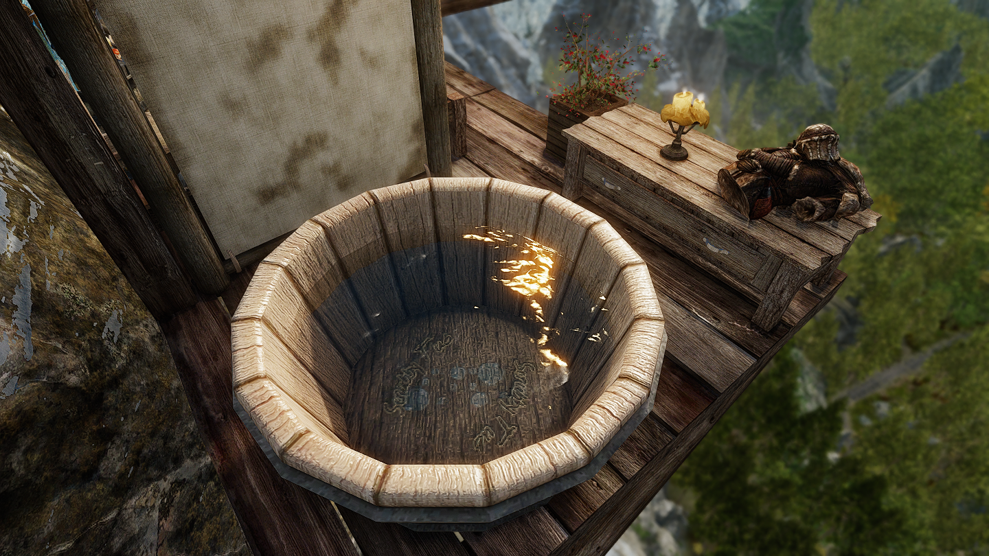 ファルクリース地方・アンジーの野営地近くに、大変見晴らしがいい少人数向けの家を追加するMODです。露天風呂付き。