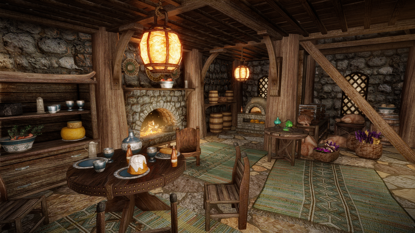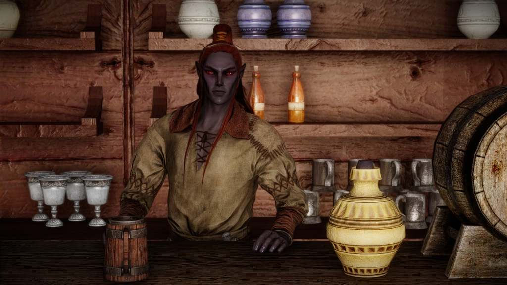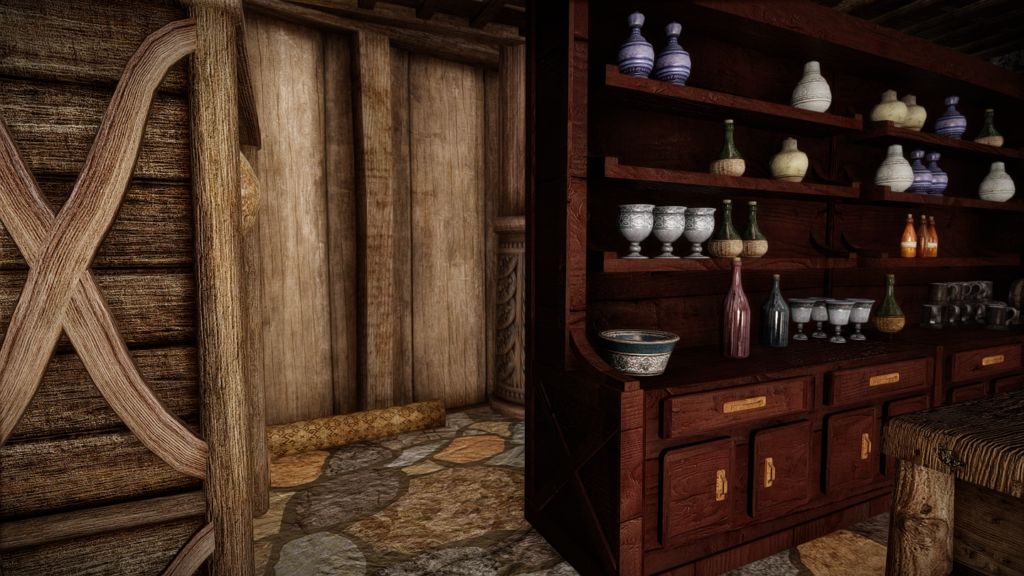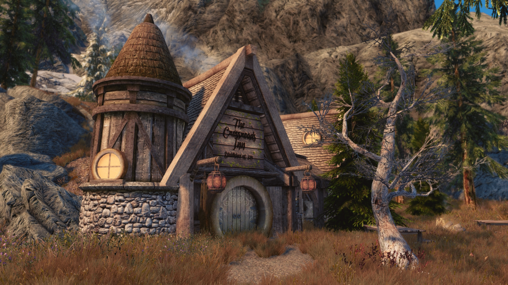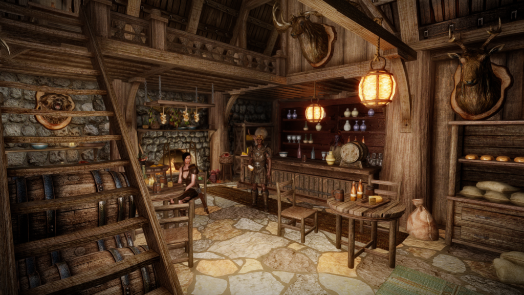 モロウウィンド風の装飾をしたおしゃれな宿屋です。ホワイトランやレイクビュー邸から寄り道をしつつ西側へ歩いているとこの辺りでいい時間になってくるので、休憩や宿泊にはもってこいの場所にあると思います。