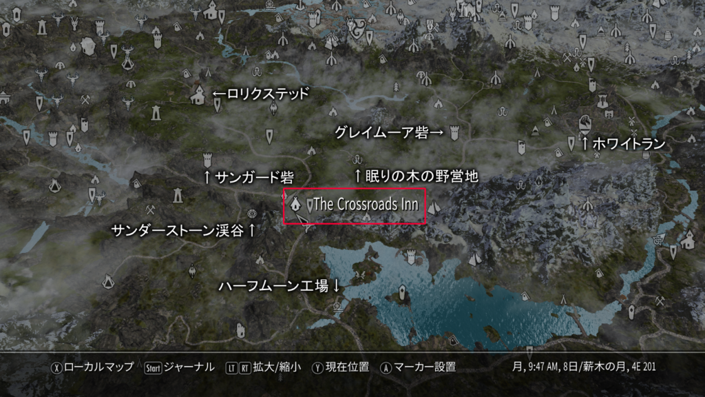 初回は現地へ向かう必要があります。宿名の通り、ホワイトラン・ロリクステッド・リーチ・ファルクリース方面と繋がる街道の交差点にあります。