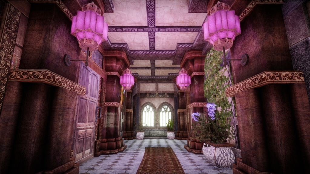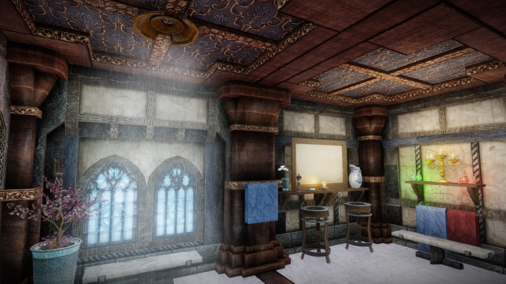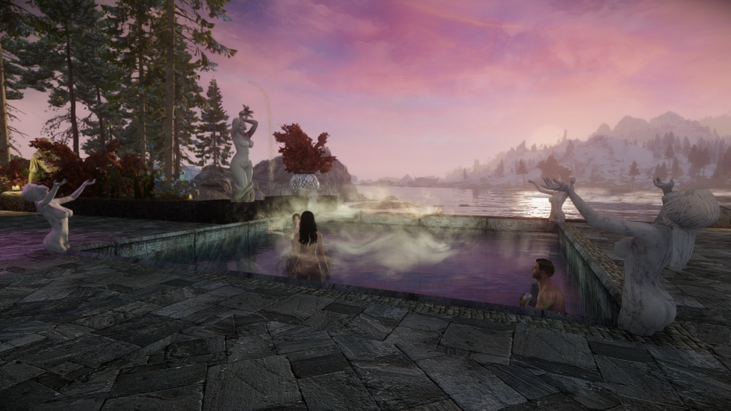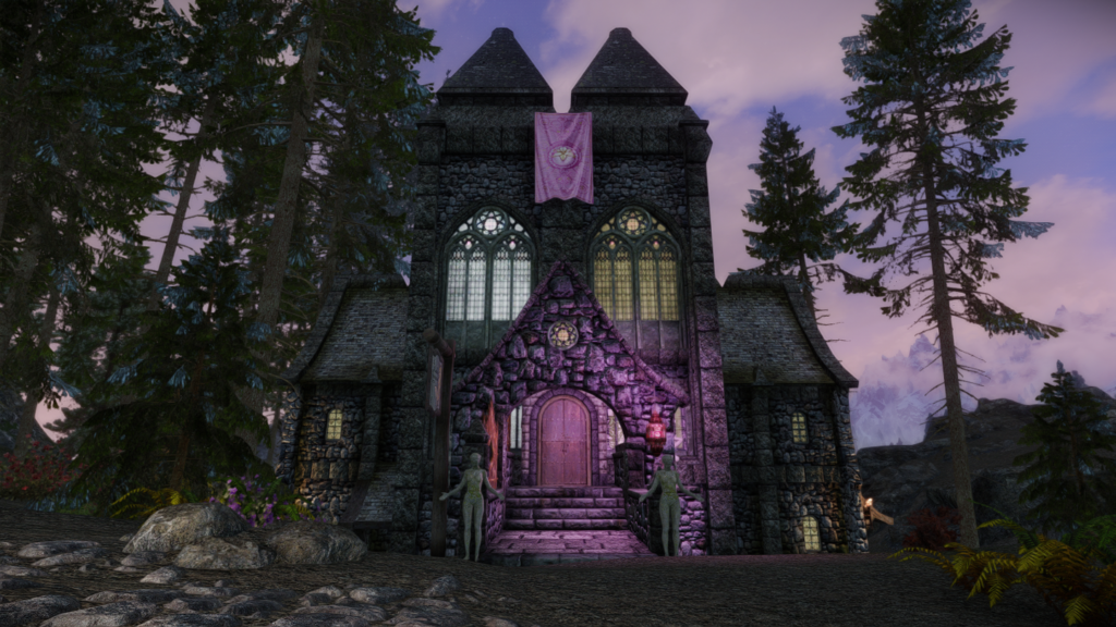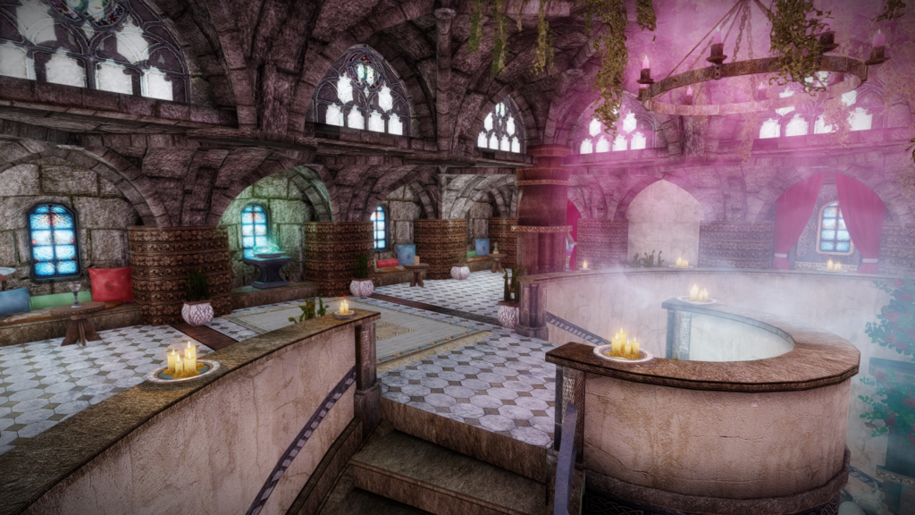ハーフィンガル地方・ソリチュードのアーチの近くに、フォロワー候補のNPCや、それとなくピンク色の酒場を追加するMODです。屋外プールや内風呂、生産設備や自由に使えるベッドもあります。