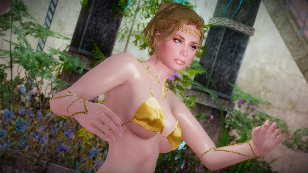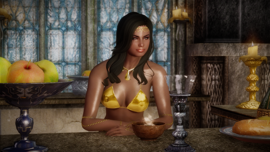 店員さんが来ている装備はプレイヤーも購入・着用することができます。Nexusのオプションファイルを導入し、更に露出度が上がったビキニに置き換えることも。そちらも下記でご紹介しています。