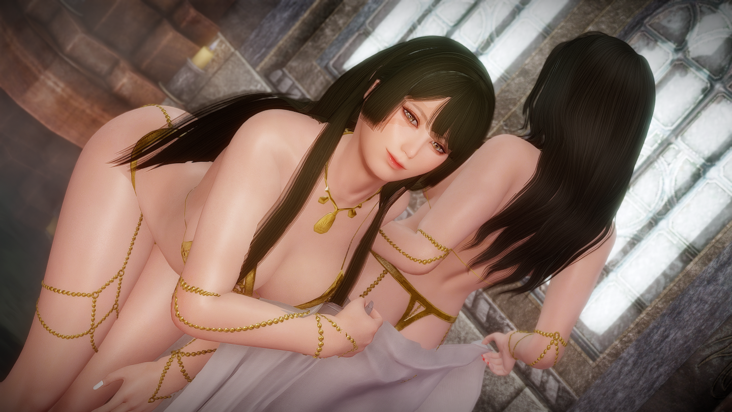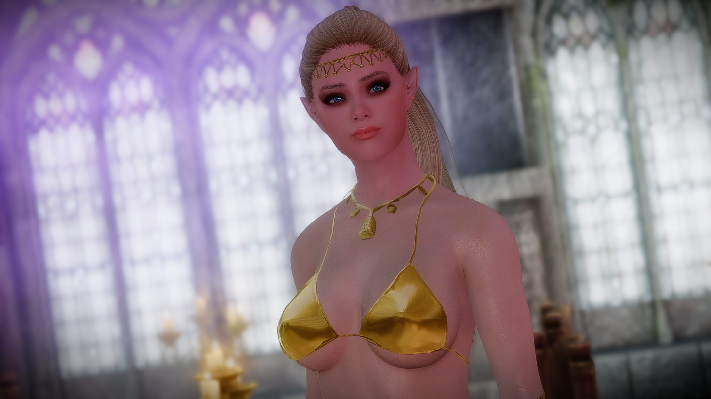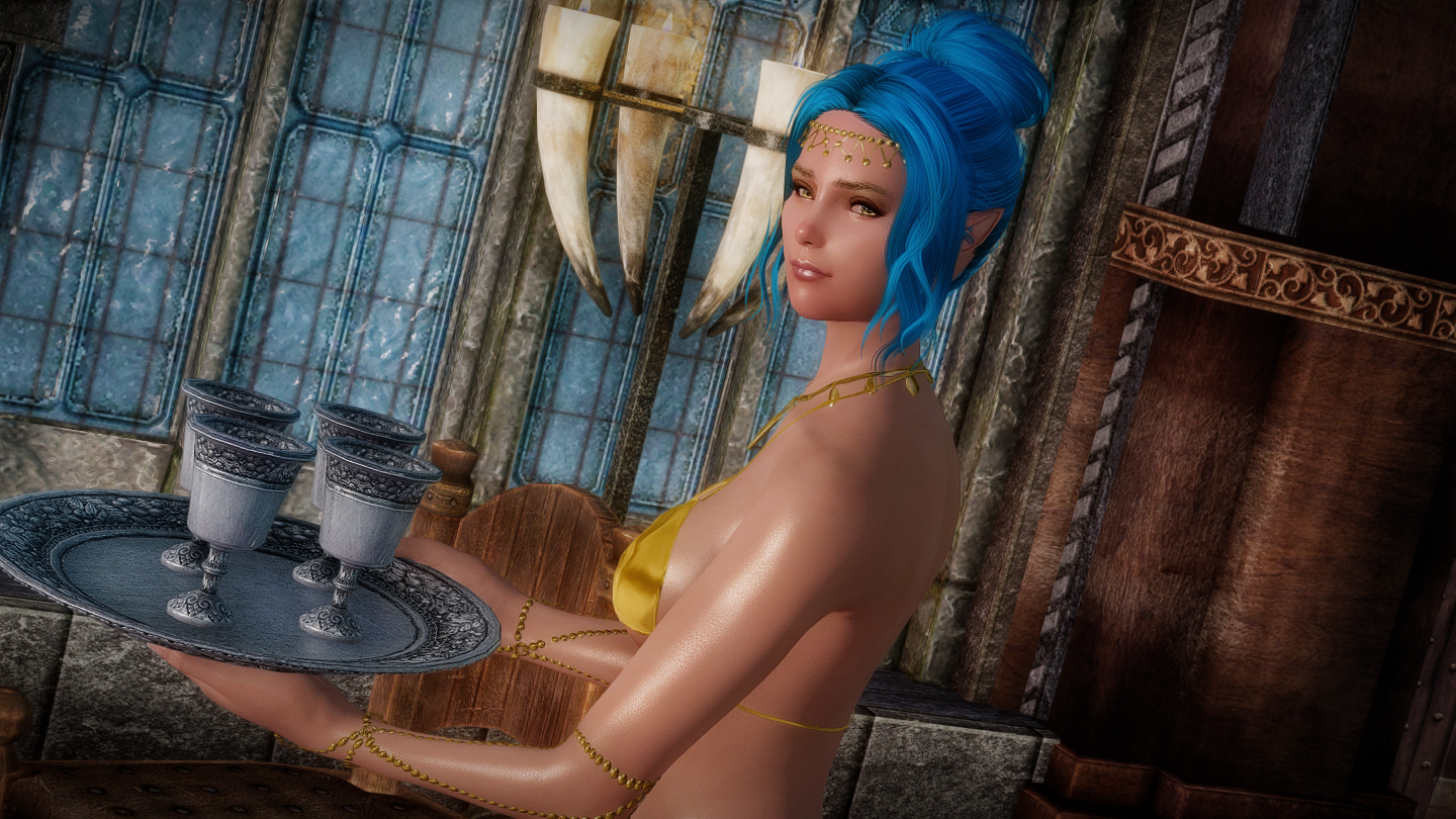 店員さんが来ている装備はプレイヤーも購入・着用することができます。Nexusのオプションファイルを導入し、更に露出度が上がったビキニに置き換えることも。そちらも下記でご紹介しています。